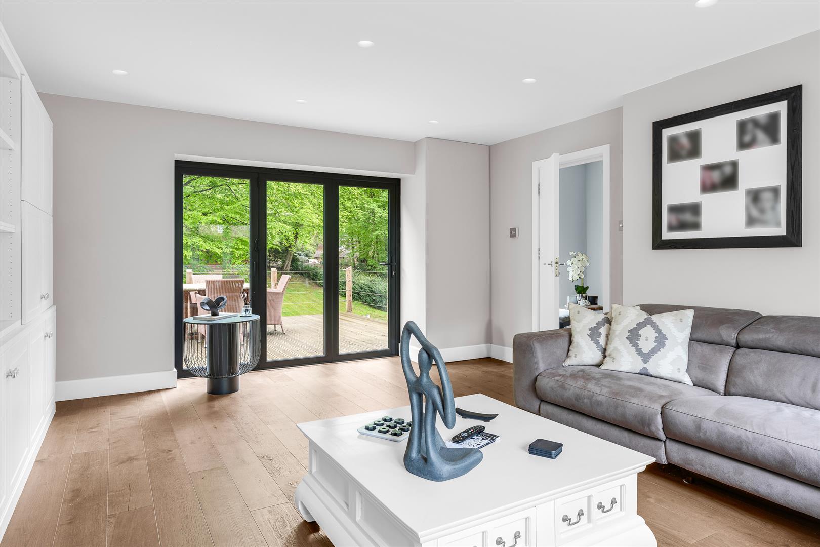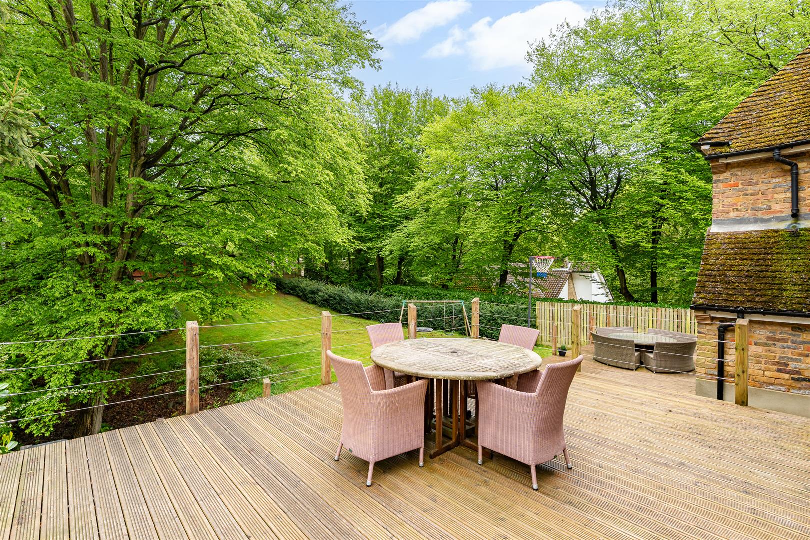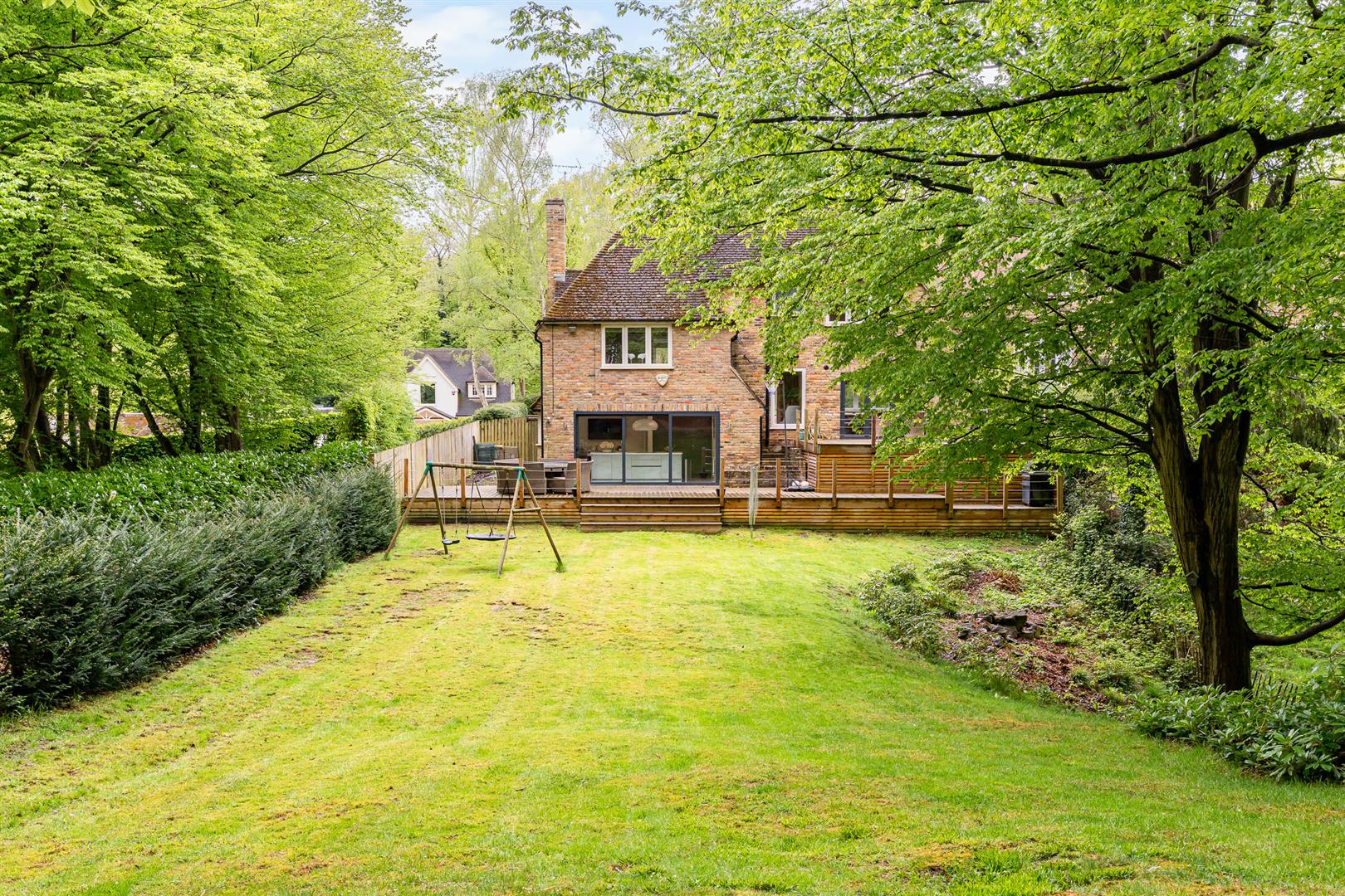 The property is set well back from the quiet residential road on which it sits, with a long driveway providing ample parking for numerous vehicles, before opening out into a further parking area in front of the house. Mature hedges and nicely filled borders line the perimeter, softly framing the house as it blends into the surrounding natural landscape. The property enjoys an appealing frontage with a variety of levels, roof lines and attractive patterned brick work. There is convenient side access through to the rear which is an absolute joyful celebration of nature. A capacious all weather decking terrace runs across the full width of the house, with two levels matching the interior to give easy access out from both the kitchen/dining room and the family room. The terrace is elevated from the garden, presenting a wonderful vista of hedges, bushes, trees and the substantial lawn as it sweeps away before you, following the natural topography of the land. What a lovely place for spending time together as a family, and a super cool entertaining space. At the far boundary of the garden is the swimming pool, located within a beautiful timber pool house nestled harmoniously into the woodland setting.