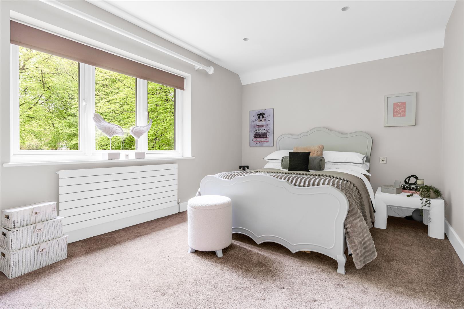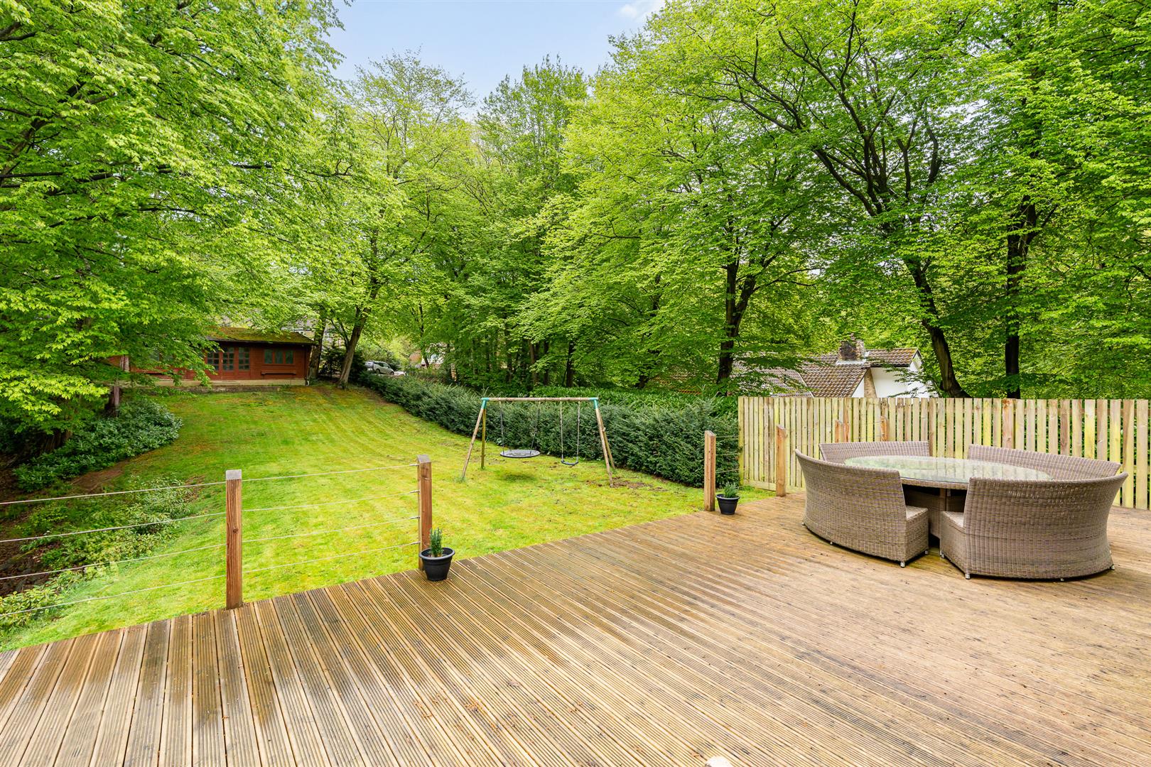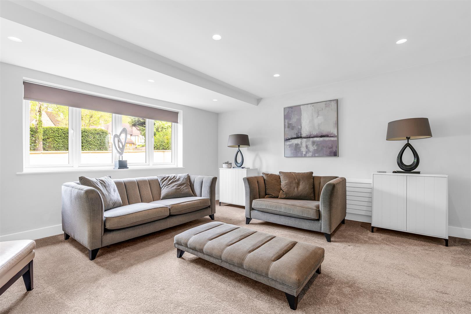 The property is set well back from the quiet residential road on which it sits, with a long driveway providing ample parking for numerous vehicles, before opening out into a further parking area in front of the house. Mature hedges and nicely filled borders line the perimeter, softly framing the house as it blends into the surrounding natural landscape. The property enjoys an appealing frontage with a variety of levels, roof lines and attractive patterned brick work. There is convenient side access through to the rear which is an absolute joyful celebration of nature. A capacious all weather decking terrace runs across the full width of the house, with two levels matching the interior to give easy access out from both the kitchen/dining room and the family room. The terrace is elevated from the garden, presenting a wonderful vista of hedges, bushes, trees and the substantial lawn as it sweeps away before you, following the natural topography of the land. What a lovely place for spending time together as a family, and a super cool entertaining space. At the far boundary of the garden is the swimming pool, located within a beautiful timber pool house nestled harmoniously into the woodland setting.