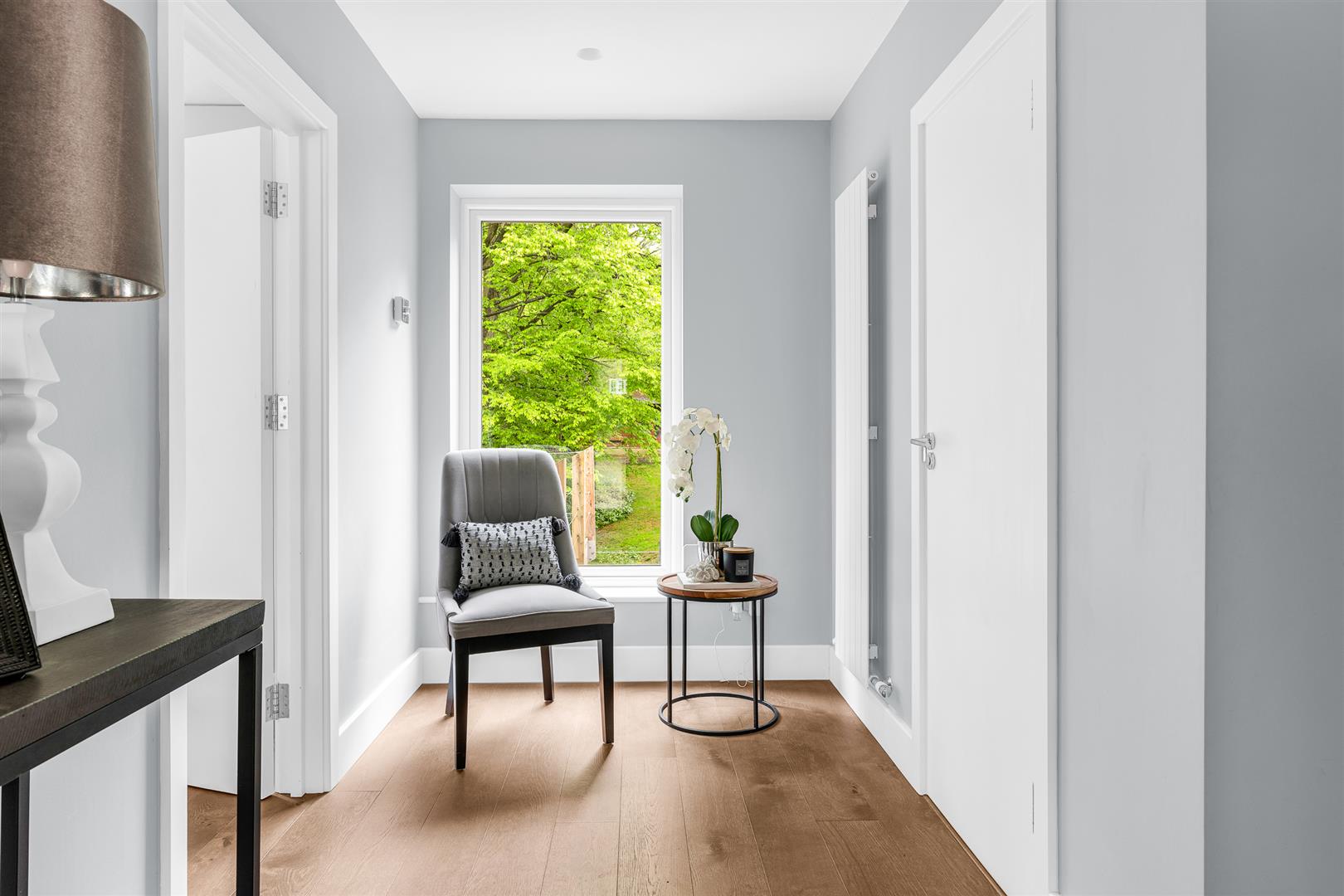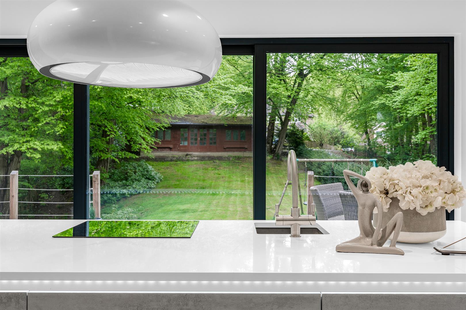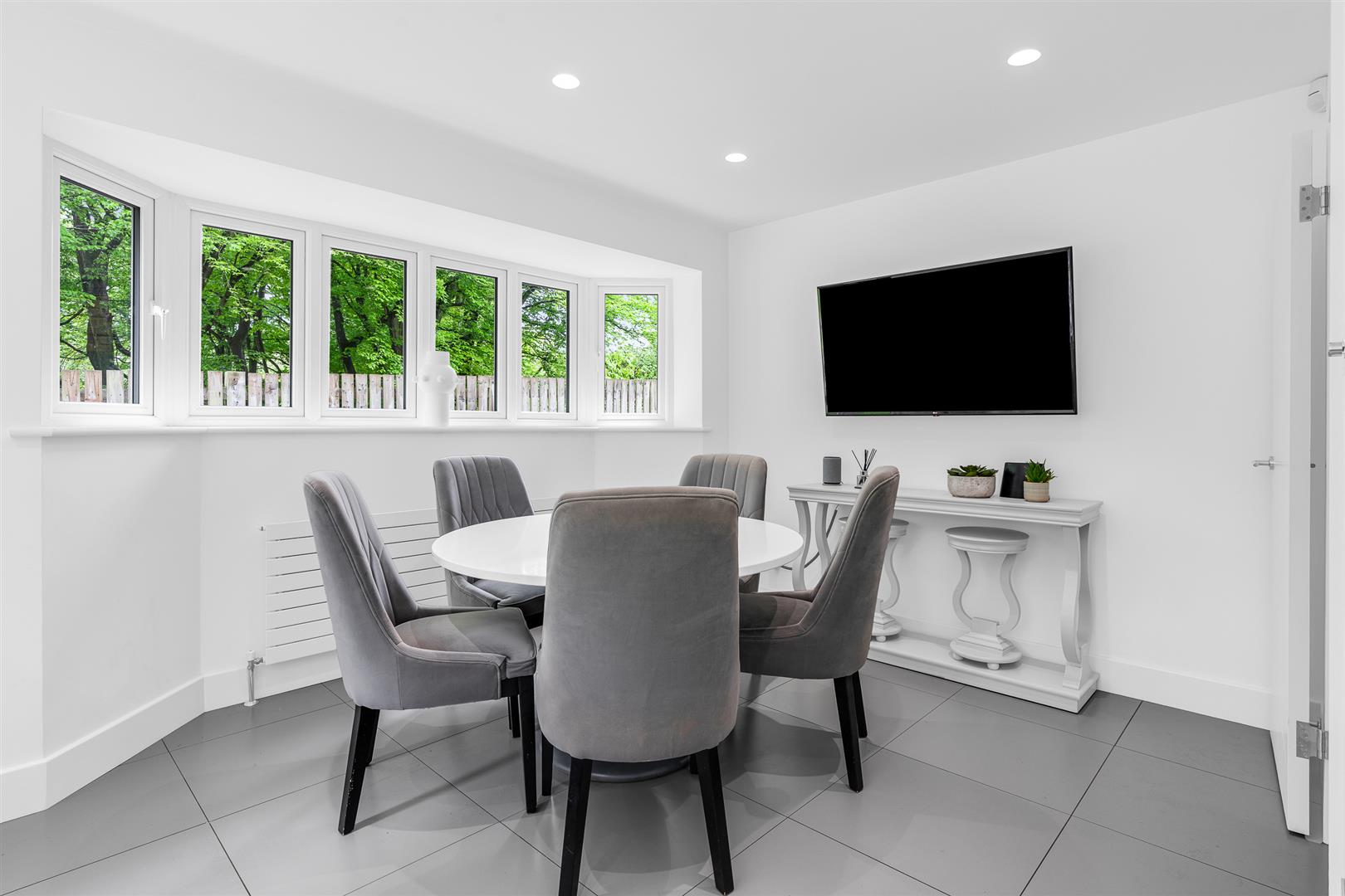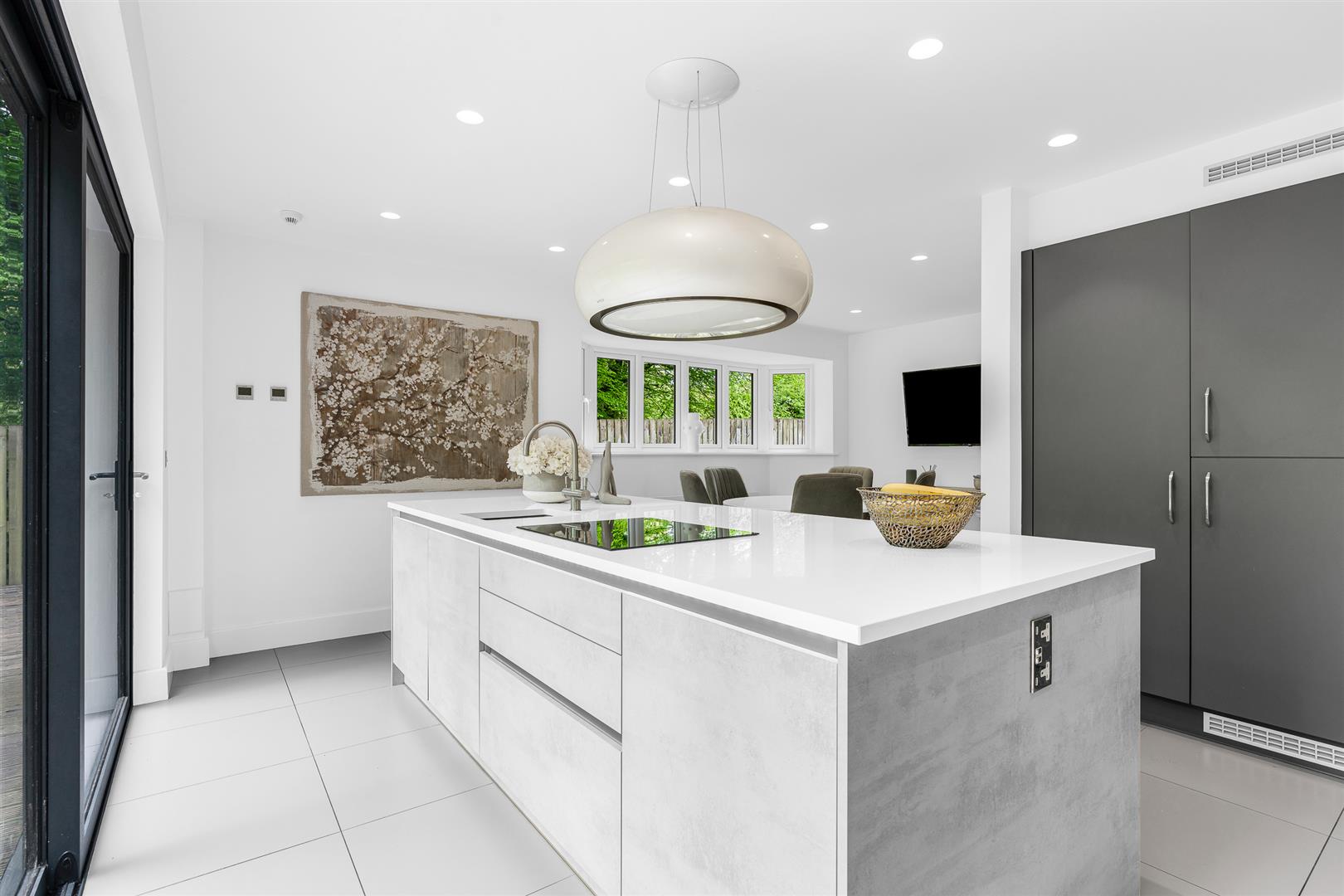 Spacious enough to easily absorb multiple sofas, chairs and other occasional furniture besides, the room is bathed in natural light through the four pane window to the front and the two separate windows set into the side wall. Between the two side windows the modern fireplace offers a nice visual balance to the space as well as an appealing focal point. To the rear of the living room is the superb kitchen/dining room. This is an absolute triumph of clean, minimalist design, with bright white worktops matching the ceiling and walls offset by the muted grey tones of the fitted cupboards and tiled floor. A substantial central island dominates the room, perfectly positioned in front of the large sliding glass doors that open onto the lower terrace, providing a great social space as well as ergonomically hosting multiple storage cupboards and the inset hob and sink. Additional storage is provided by cupboards subtly absorbed into recessed wall spaces, incorporating a full range of premium appliances whilst keeping the overall feel of the room neat, clean and clutter free. The remainder of the room extends into a delightful bay window and is left as open floor space, ready to be occupied by a large dining table and chairs. A lovely spot for casual or formal dining with family and friends.