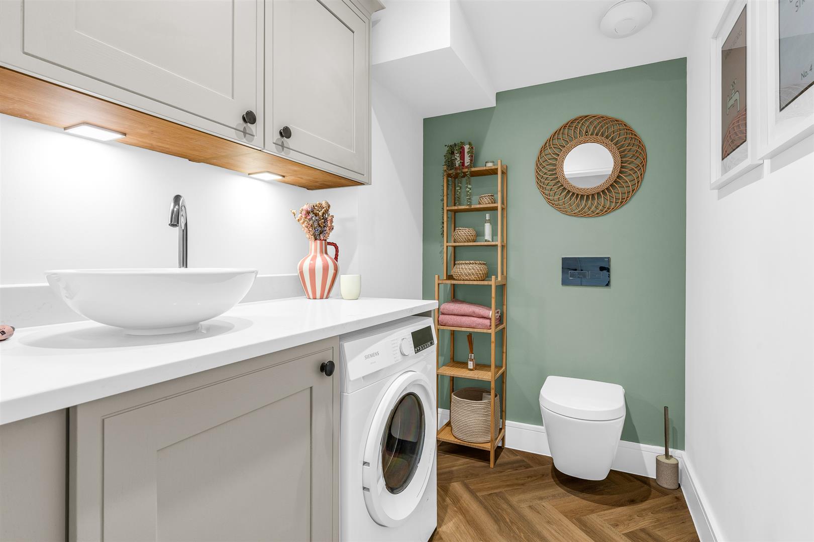 From the rear of the living room a door leads through into an inner hallway through the centre of the house, with a substantial cupboard on one side and a perfectly located guest cloakroom on the other which cleverly doubles up as a useful and well specified utility/laundry room.