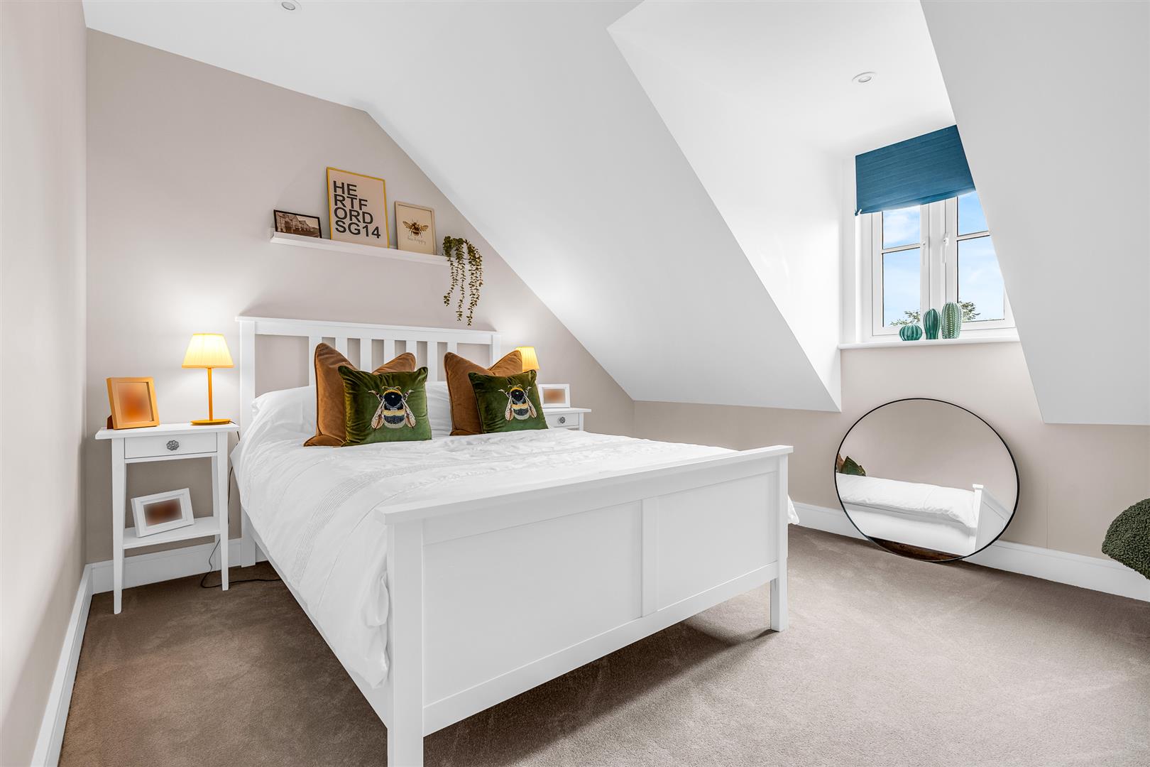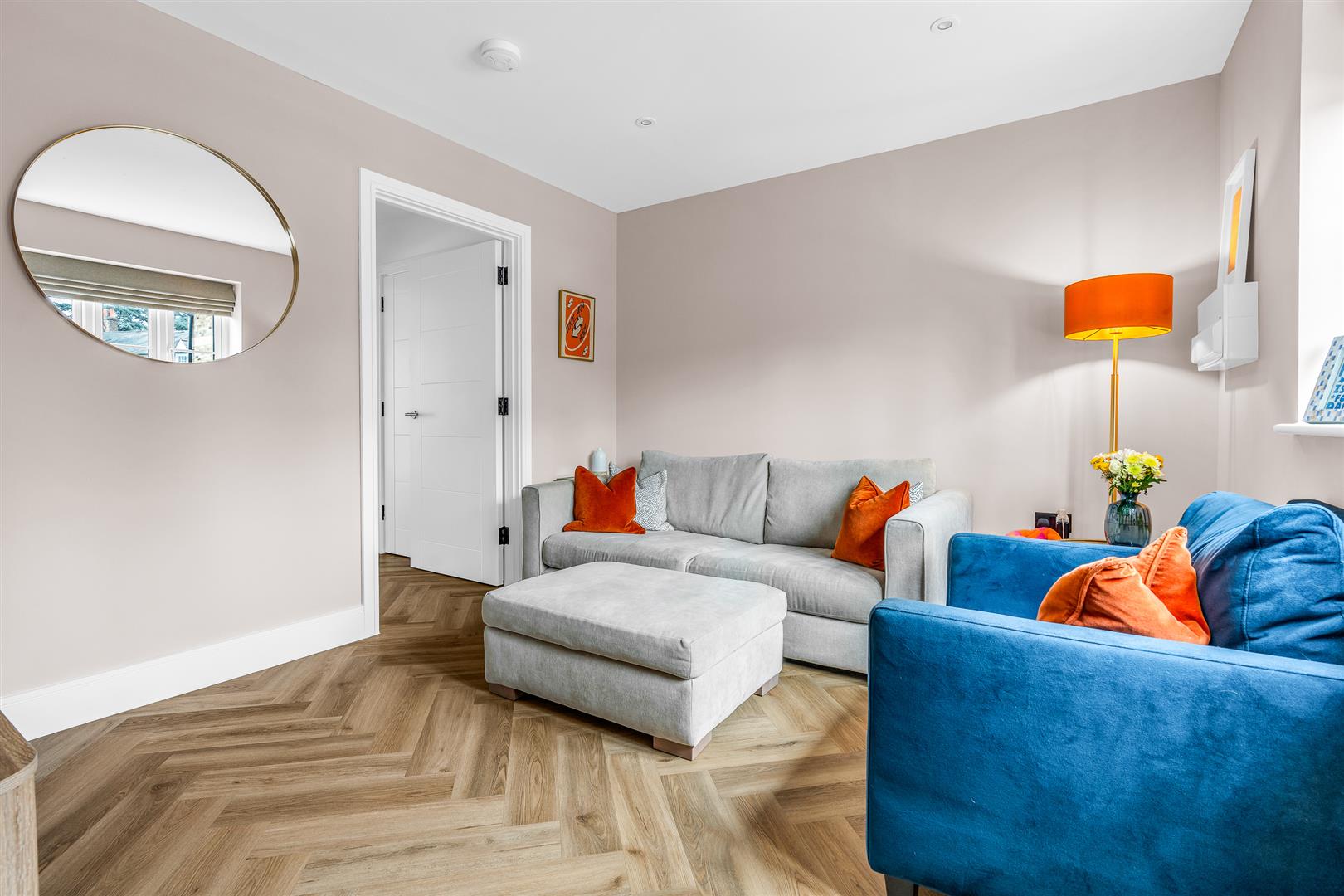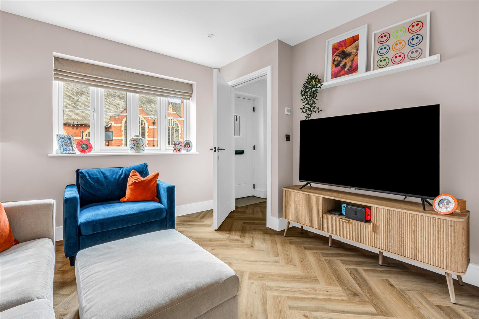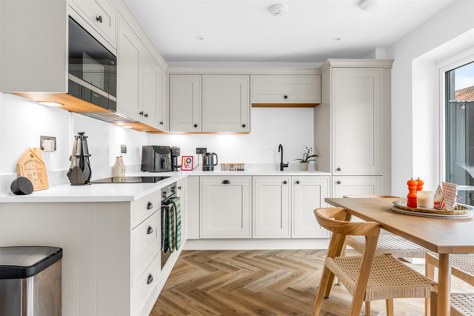 The house was constructed by one of the area’s premier residential building companies, and the quality of workmanship, materials and design is clear to see in every little detail. The development of exclusive residences runs along the banks of the river Beane and was built around a central courtyard offering ample off-street parking, using an appealing mixed colour assortment of bricks that presents a perfect visual contrast against the matt black of the doors and window frames. Inside there is a neat entrance hall at the foot of the staircase, along with a door through into the front facing living room. There is also a useful storage cupboard in the hallway, big enough to cater for a tumble dryer or other large appliance.