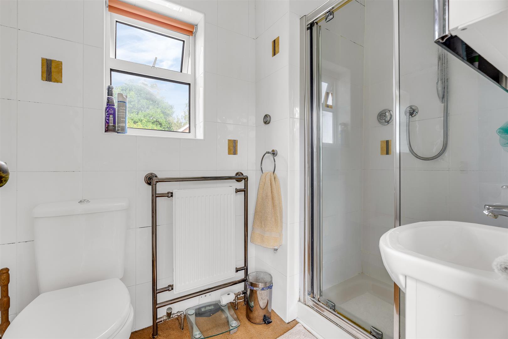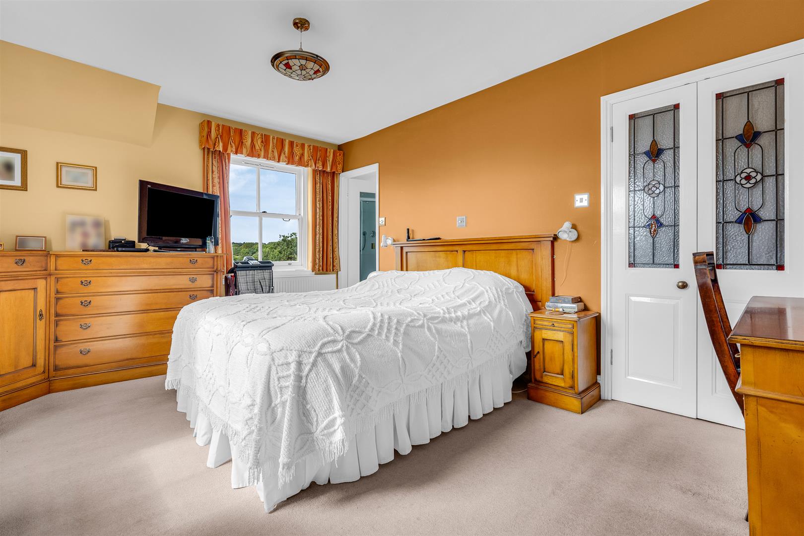Upstairs we find four bedrooms and two bathrooms. Two of the bedrooms are more than generous doubles in size, with one of them enjoying a full wall of fitted wardrobes. The principal bedroom boasts an en-suite shower room and a delightful walk in wardrobe with ornate stained glass windows gracing the doors. The family bathroom has a bath with shower attachment.