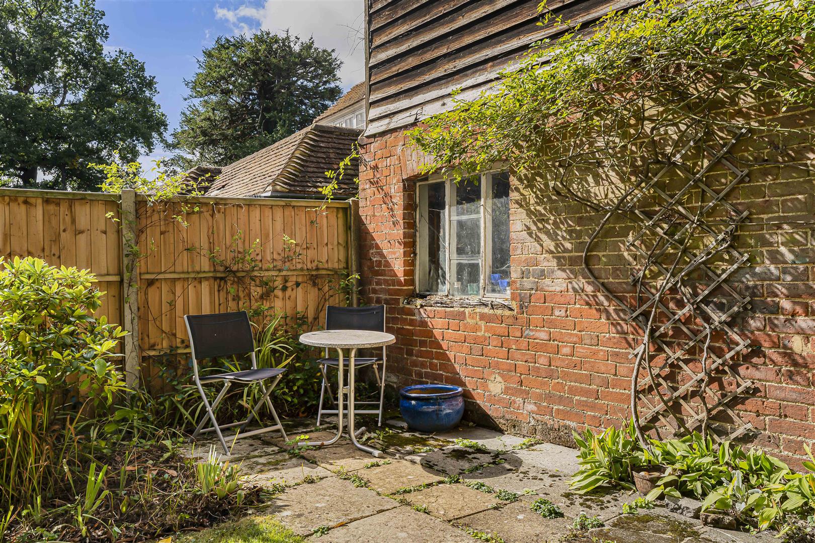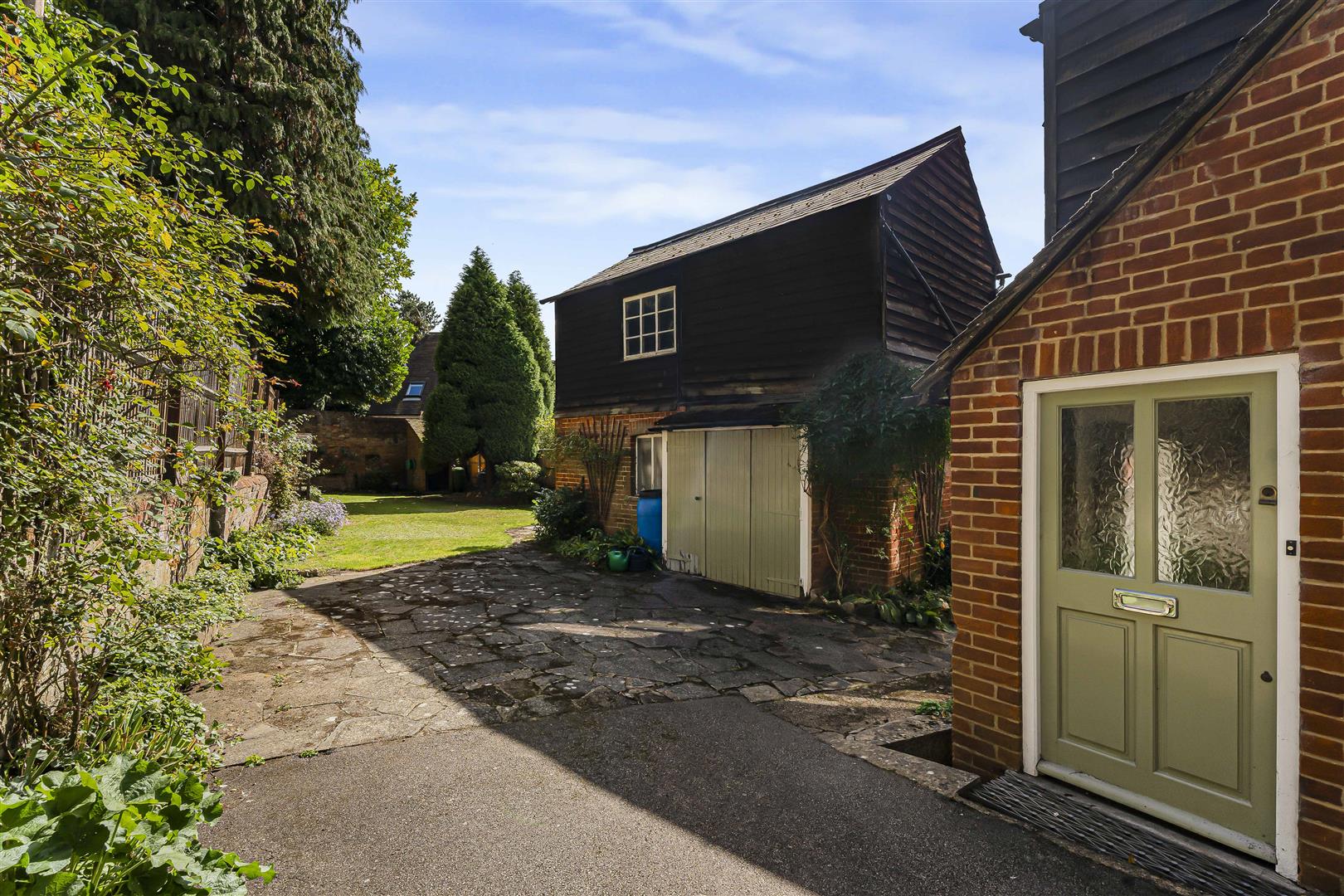 Large wooden double gates lead from the roadside into a wide driveway that opens into a substantial courtyard, extending across the rear of the house and around the side of the barn, allowing secure private off street parking for multiple cars, a rare and precious facility in a central village location. Beyond the barn is a paved patio and a large lawn with neat flower borders lining the perimeter. Again, the size of the garden is unusual for such a well located property.