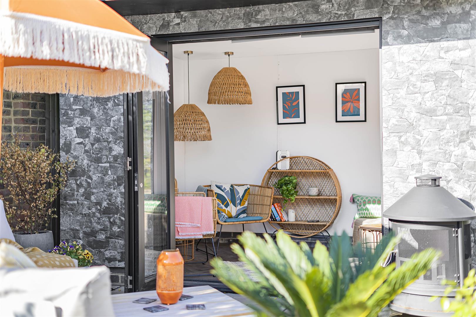 From the living room, a few steps take you down into the amazing kitchen/dining room. This room really delivers the WOW factor as you enter, with full width infinity doors flooding the room with light, ably matched by a glass roof stretching across the whole of the rear of the room. With open sky above and a beautiful vista stretching out across the patio to the garden room and then on into the far distance beyond, this room creates a fully Mediterranean experience right at home in Hertfordshire. It is an absolute joy, with the dramatic dark tones of the kitchen cupboards and worktops contrasting perfectly with the white walls and ceilings and the smart white tiled floor. Intelligent design has placed the fitted area of the kitchen around one side of the room, ensuring a good ergonomic layout, with more than ample storage provided by a comprehensive array of wall and floor mounted cupboards, along with a large island hosting more storage and a sink/drainer along with a useful breakfast bar. A full complement of quality appliances are integrated within the cupboards, with space designated for a free standing, double fronted fridge freezer which is plumbed in for a water cooler/ice maker. The rest of this capacious room is left open plan to use as best suits your lifestyle, and will easily absorb a generous dining suite as well as some casual seating. This room is sure to become the hub and heart of this fabulous home, with the incredible light and space, along with the wonderful free flow between the inside and outside, making it a wonderful place to spend time, both in your day to day lives, but especially when entertaining guests.