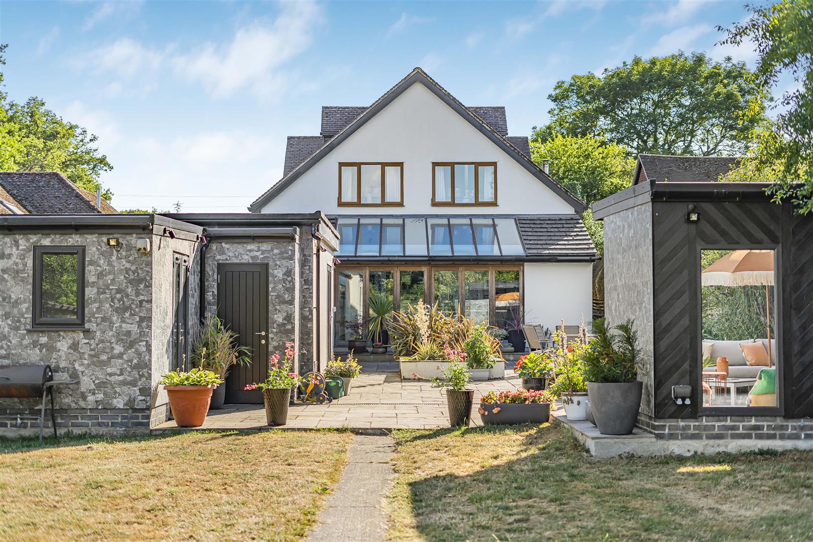 The house is set well back from the road, with a carriage driveway curving around a raised central feature lined with neat hedging. There is ample parking for cars beyond the two gated entrances, whilst a further driveway then runs alongside the house, opening into another area of hard standing in front of the double garage. Double gates give access through from the driveway into the rear garden, which is fully secure and enclosed and so ideal for children and pets. Running from the rear of the house alongside the garage and separate spacious workshop to the lovely garden room beyond is a superb patio, providing abundant space for relaxing and entertaining in a wonderfully sheltered spot between the house, outbuildings and the boundary wall. Raised beds in the centre and along one side show an appealing display of ornamental shrubs and grasses entirely in keeping with the surroundings. Double doors open into the rear of the garage and the workshop, making them both really usable spaces on a day to day basis, currently the garage serves as a game room and benefits from a cleverly placed garden WC set between both buildings. The garden room at the far end of the patio area is a premium quality installation with large bi-fold glass doors and a further full height window to the rear, along with power and light connected that makes it absolutely usable all year round. It would serve admirably as a gym, office, arts and crafts studio or a teenage hangout space, just as it works so well now as a garden lounge. Beyond the outbuildings the garden stretches away into the far distance with a delightful amalgam of lawn, bushes, shrubs, hedges and a fantastic selection of fruit trees, a wonderful natural space in which to relax and decompress after a busy day, enjoying the calming open aspect all around you.