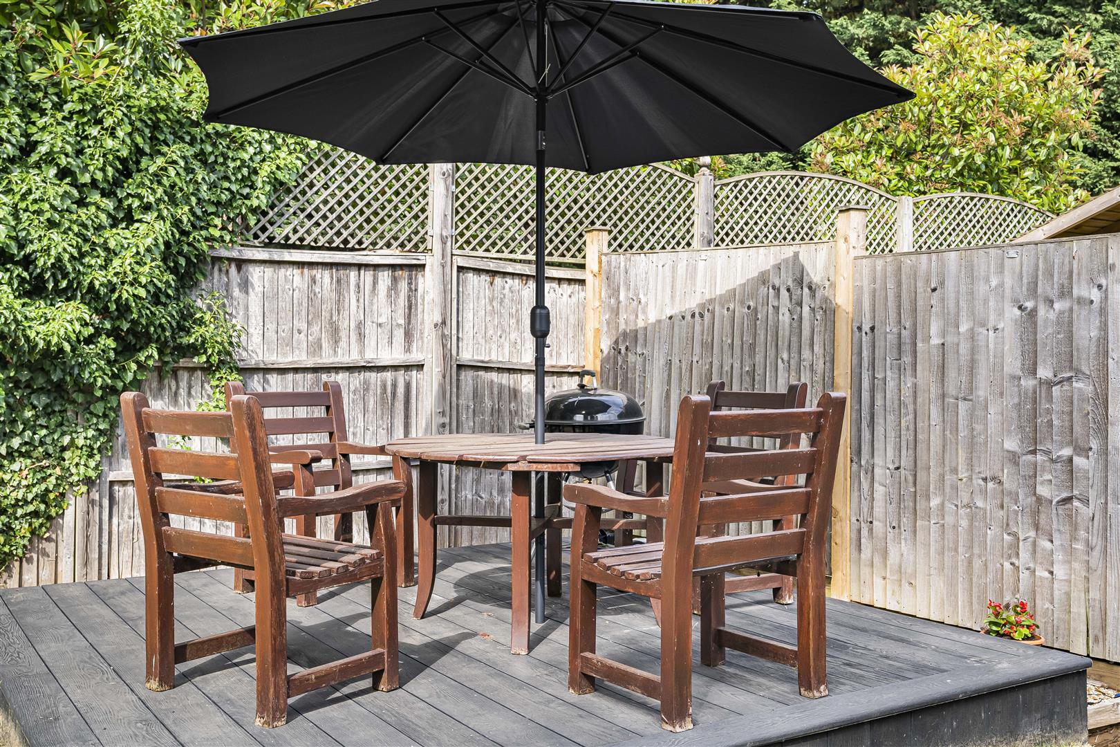 To the front a paved pathway flanked by mature hedges leads through into a sheltered courtyard garden outside the kitchen. The rear garden is a great size and shape with multiple all weather decking areas arranged into neat terraces as they follow the gently sloping lawn up to a further separate decking area just perfect for dining al fresco. The garden extends along the side of the house and around to the front of the dining room and is ideal for children and pets as it is fully enclosed and secure.