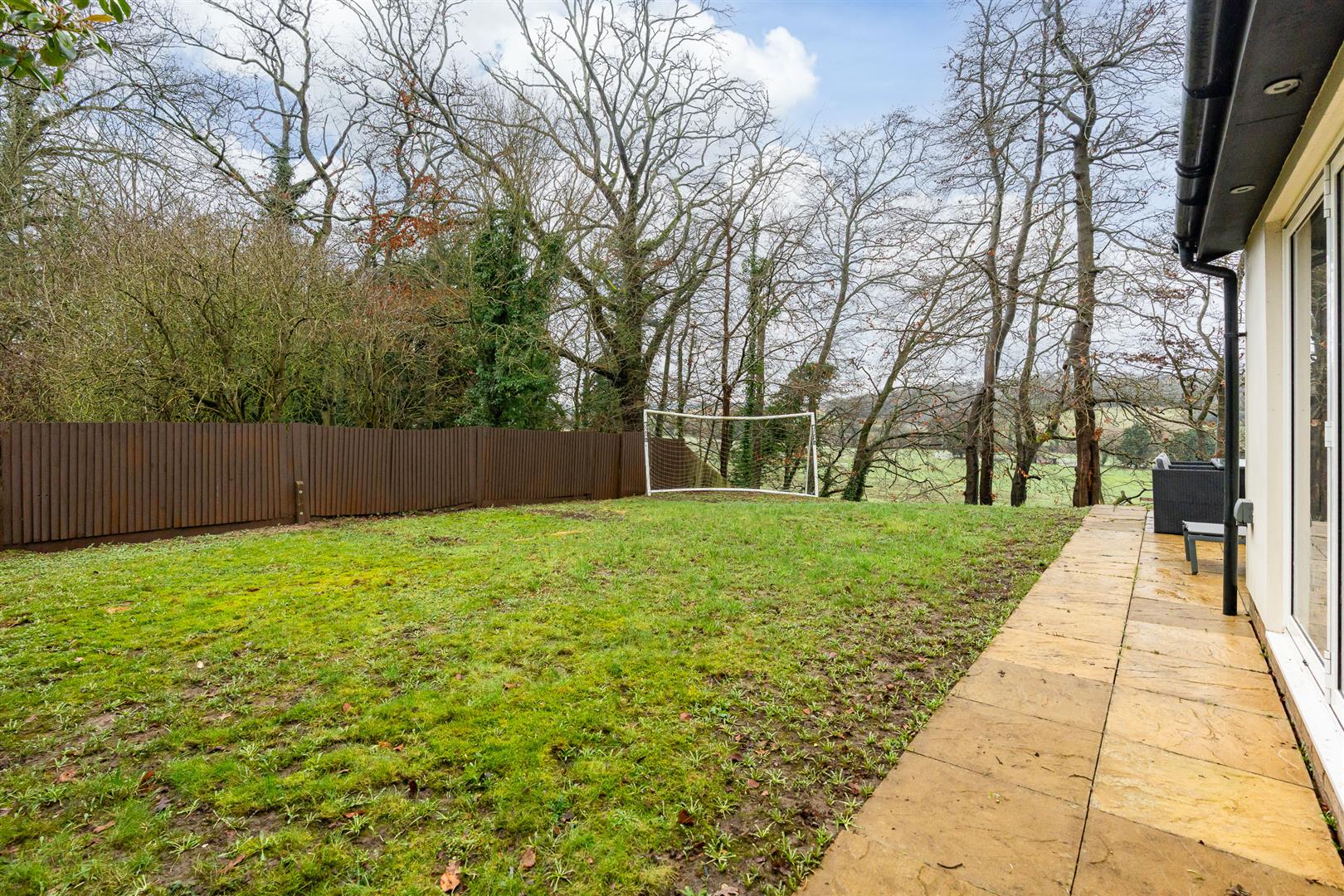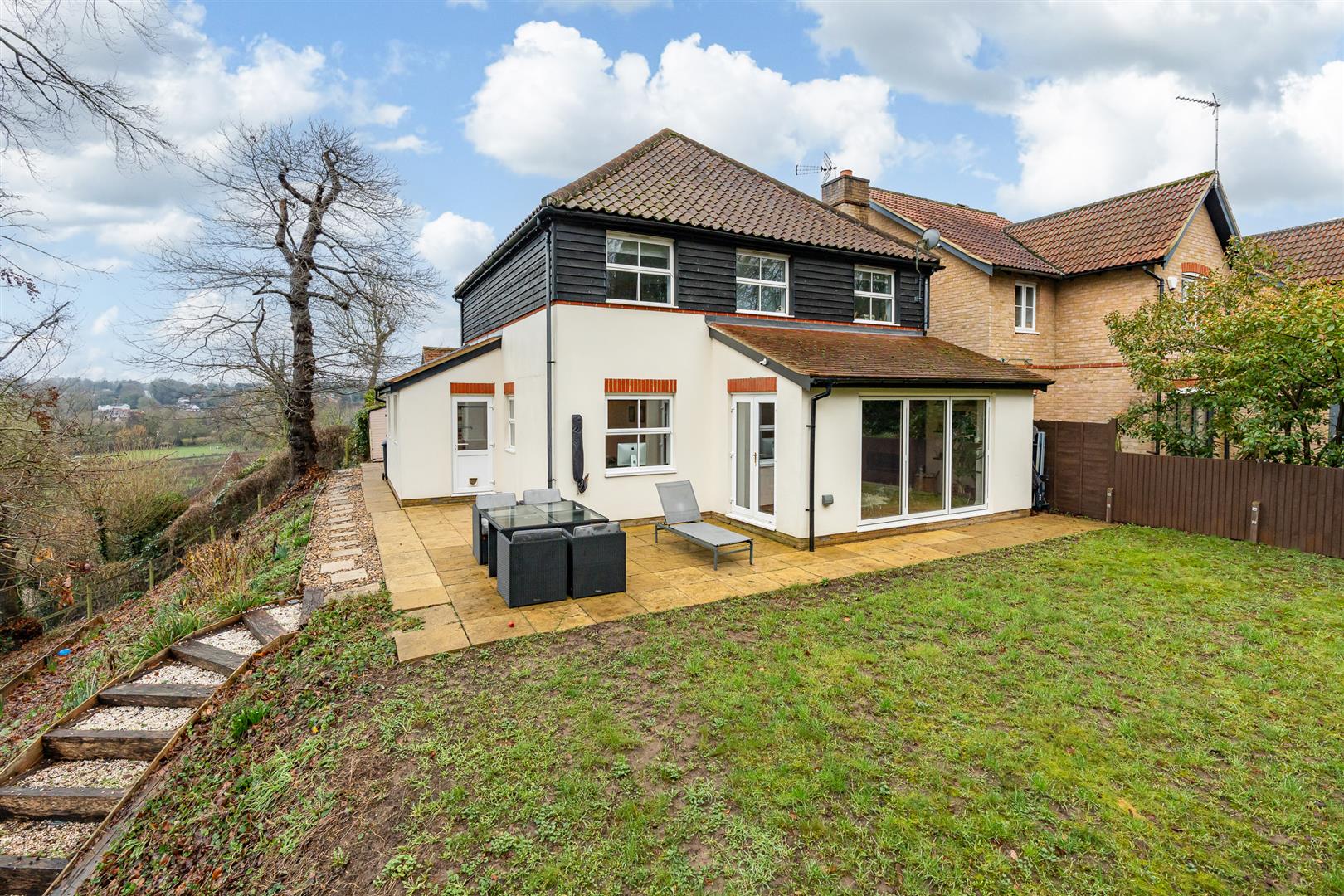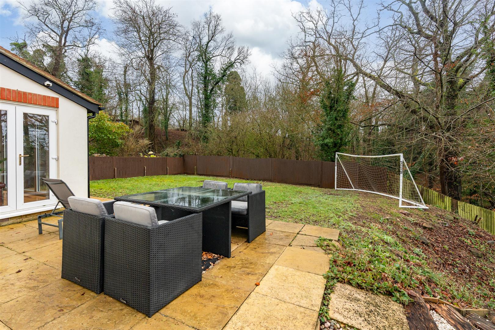Set at the end of a quiet residential cul-de-sac, the house has a substantial block paved driveway that provides off-street parking for multiple cars as it leads to the detached garage, which has a useful separate pedestrian access, and a lovely deep flower bed in front of the house. There is convenient, secure gated access from the front through to the rear garden, which benefits from the corner plot situation as it flows around two sides of the house. A paved patio runs right around the perimeter of the house, neatly linking the many access points in the kitchen and living room, opening into a large space that is perfect for outdoor casual seating and dining furniture. The main garden area is a generous lawn, but it also enjoys a charming wooded area that slopes away to a delightful picnic spot below. The garden has a wonderful open aspect all around, surrounded by nature with some glorious elevated views out across the surrounding countryside.