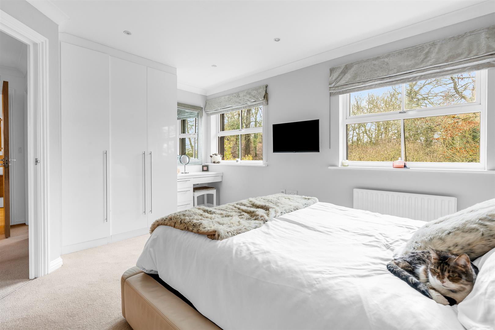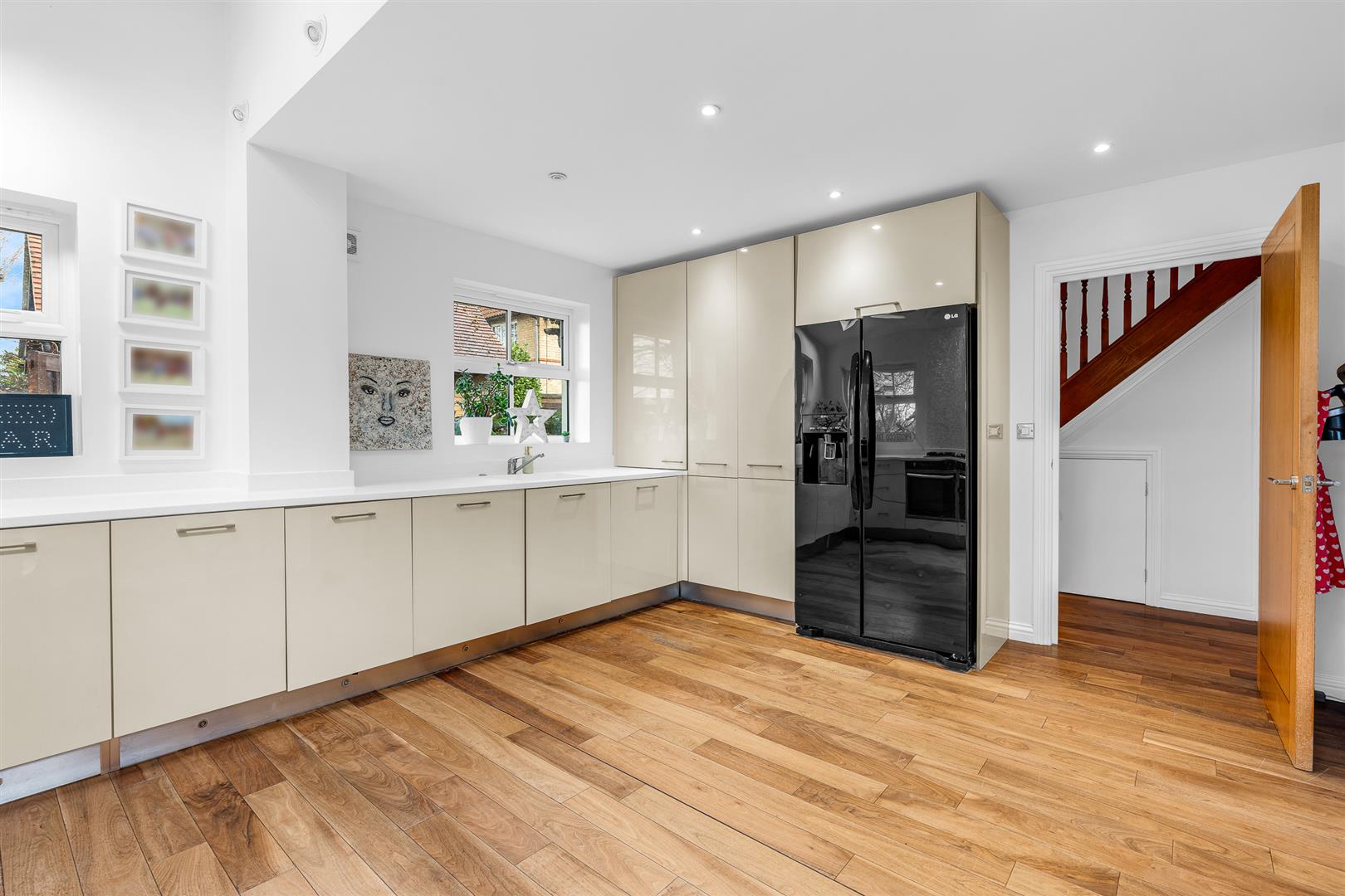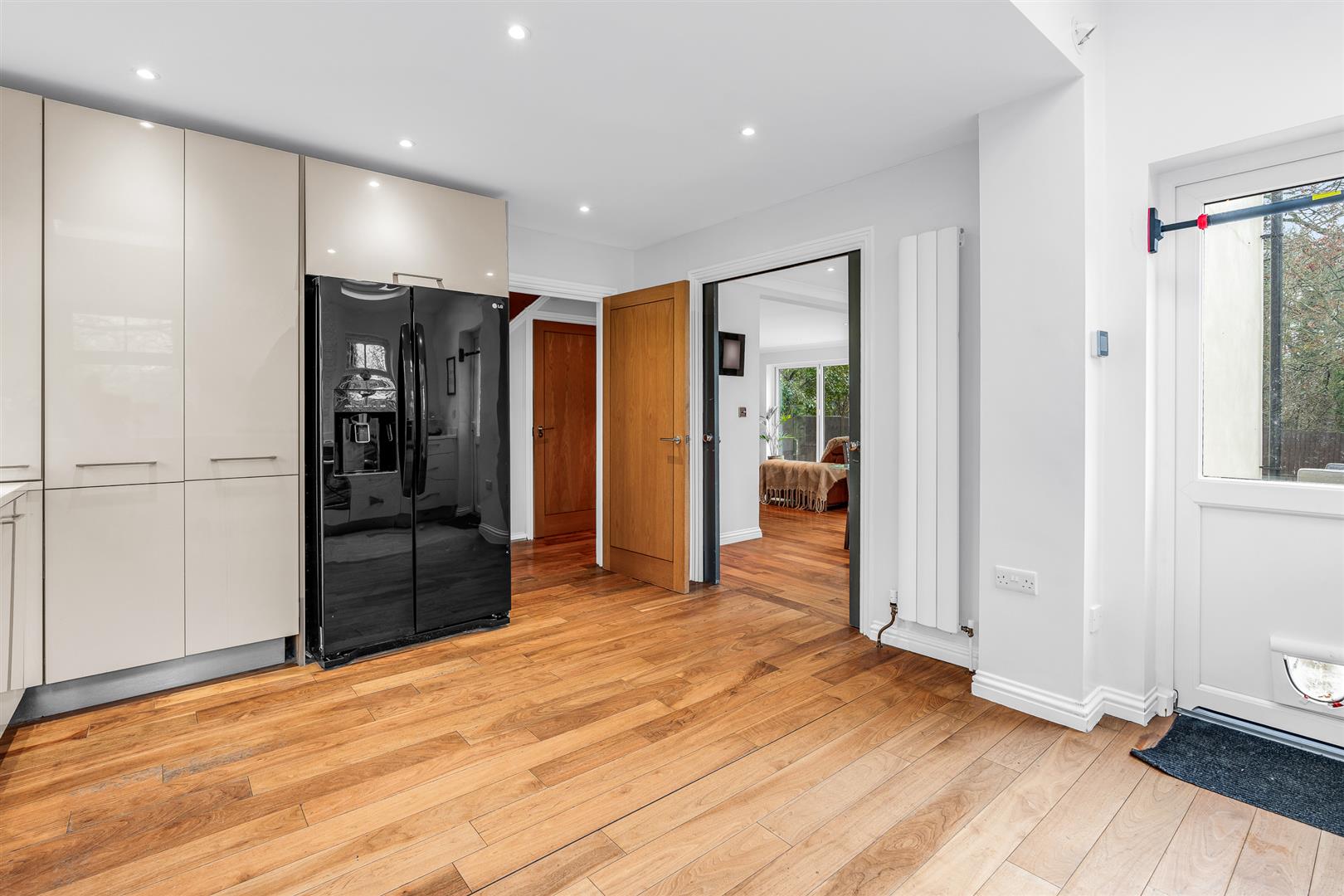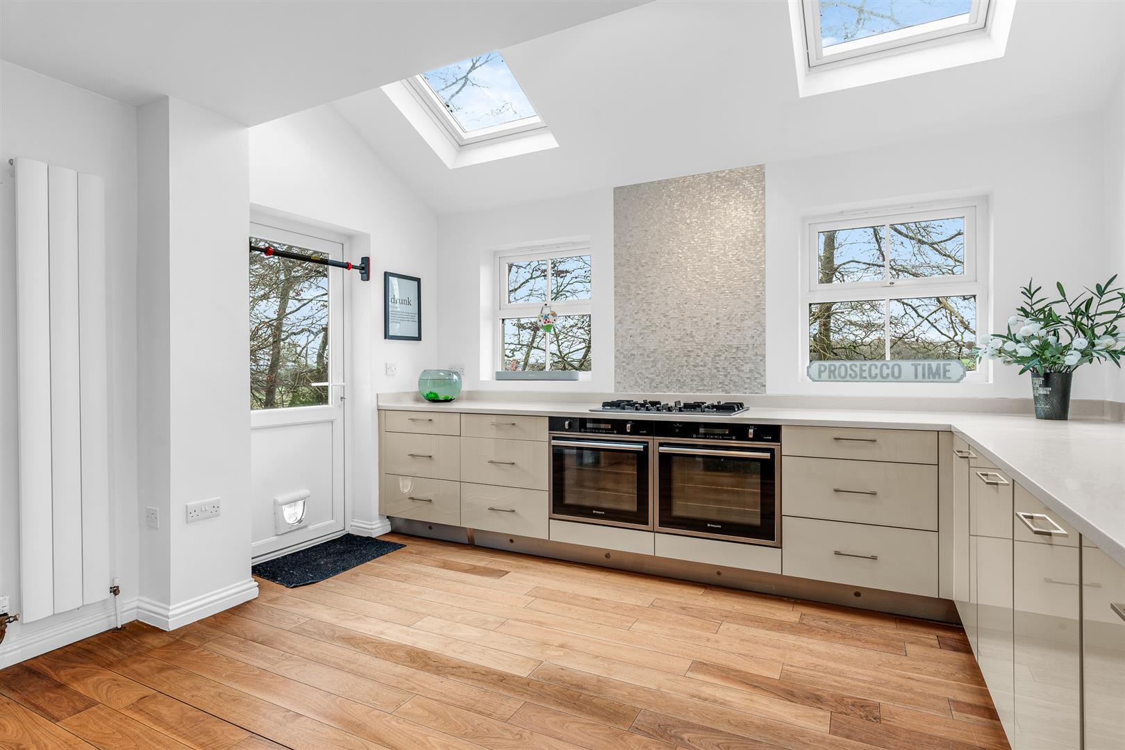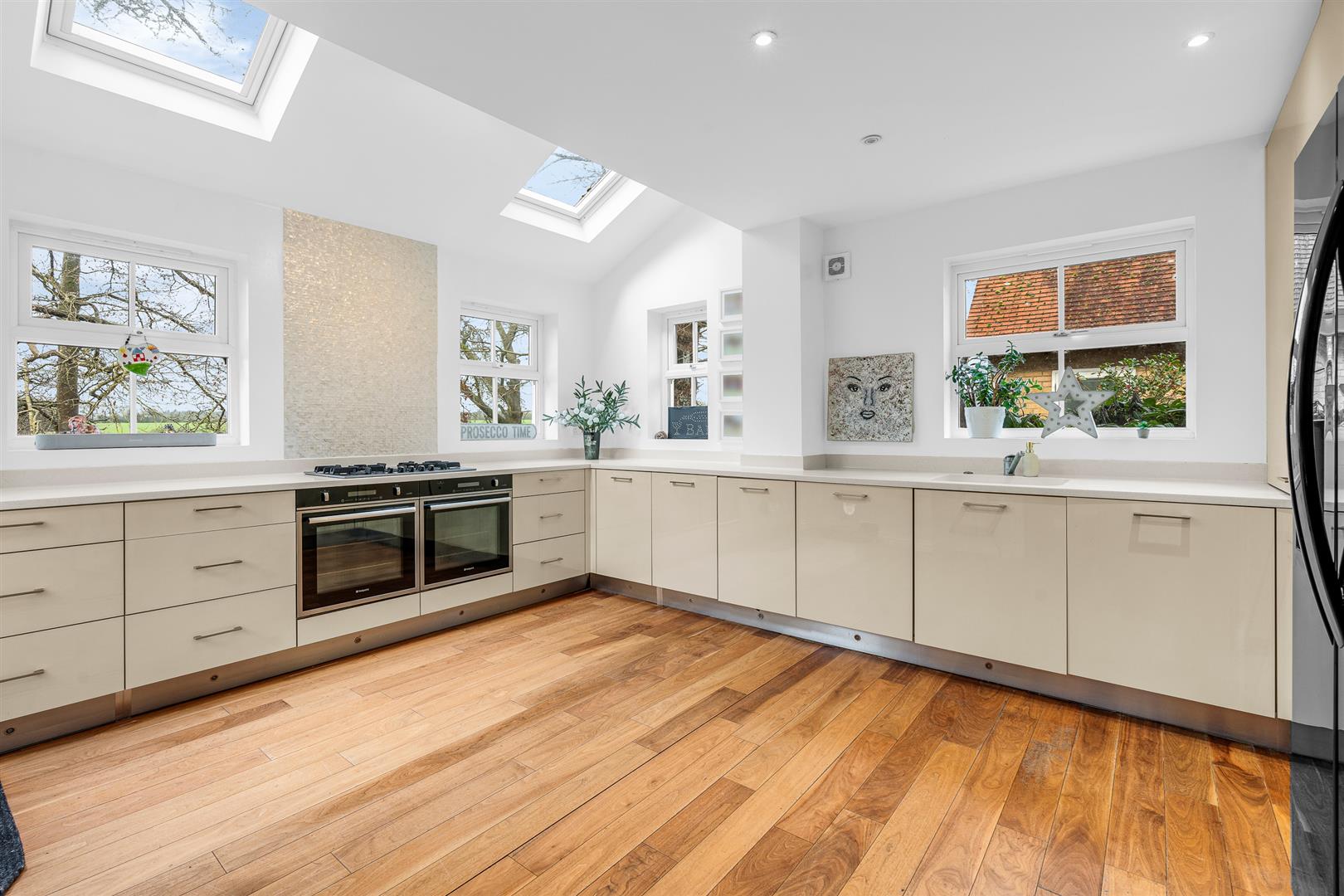 The kitchen faces the front of the house and is a large room that is blessed with high levels of natural daylight thanks to no less than four separate windows arranged across two different aspects, boosted even further by two fabulous Velux roof lights set into the ceiling. The design and layout of the room creates a wonderful, welcoming space with views out across the rear garden to a natural wooded area and the open countryside beyond. The room is blessed with a comprehensive array of wall and floor mounted cabinets around the perimeter which ensure you will never run short of storage space or food preparation worktop area. Within the cabinets is a full complement of all the appliances you may need, including twin full size ovens, along with a designated space planned in for a free standing double width fridge/freezer. Despite the abundant cupboards around the outside walls, the room still has plenty of open floor space at its centre, meaning it would easily accept a stand alone island with a breakfast bar, or a free standing breakfast table for casual meals if you so wished.