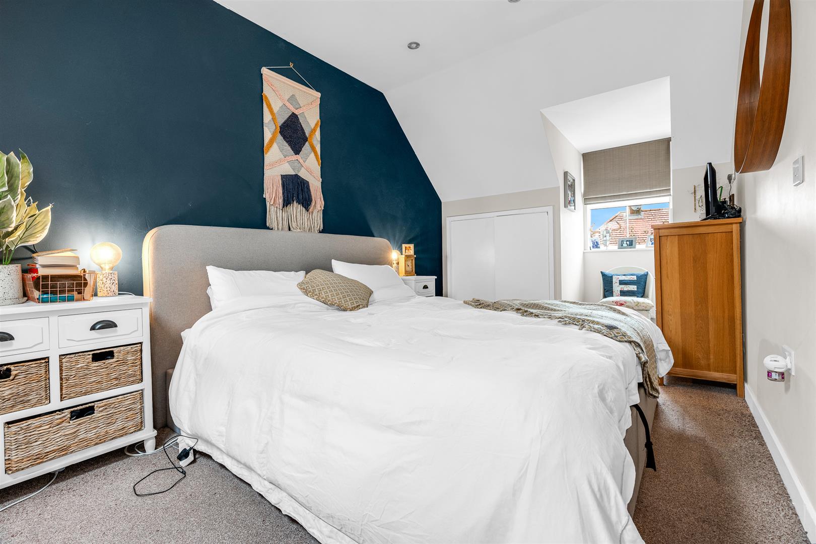 Up on the first floor a spacious hallway, nicely galleried over the stairwell, leads on to two of the three bedrooms and the spacious family bathroom, which has a bath fitted with a shower attachment and curtain track above it. One of the bedrooms is a generous double, whilst the other would comfortably fit two singles. Up on the second floor is a delightful double bedroom, abundantly lit by a front facing dormer window and two velux roof windows to the rear, benefiting from multiple cupboards built into the eaves.