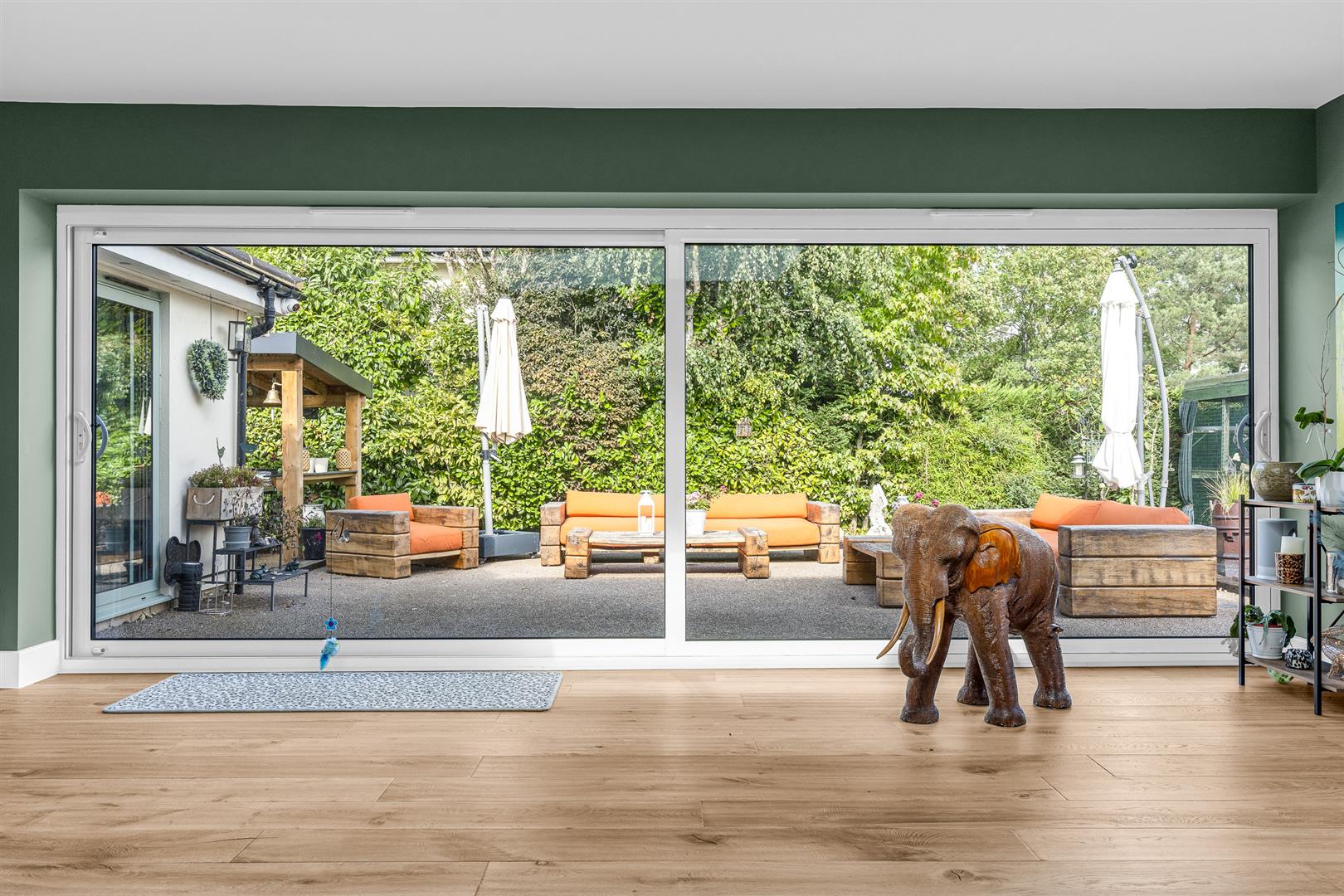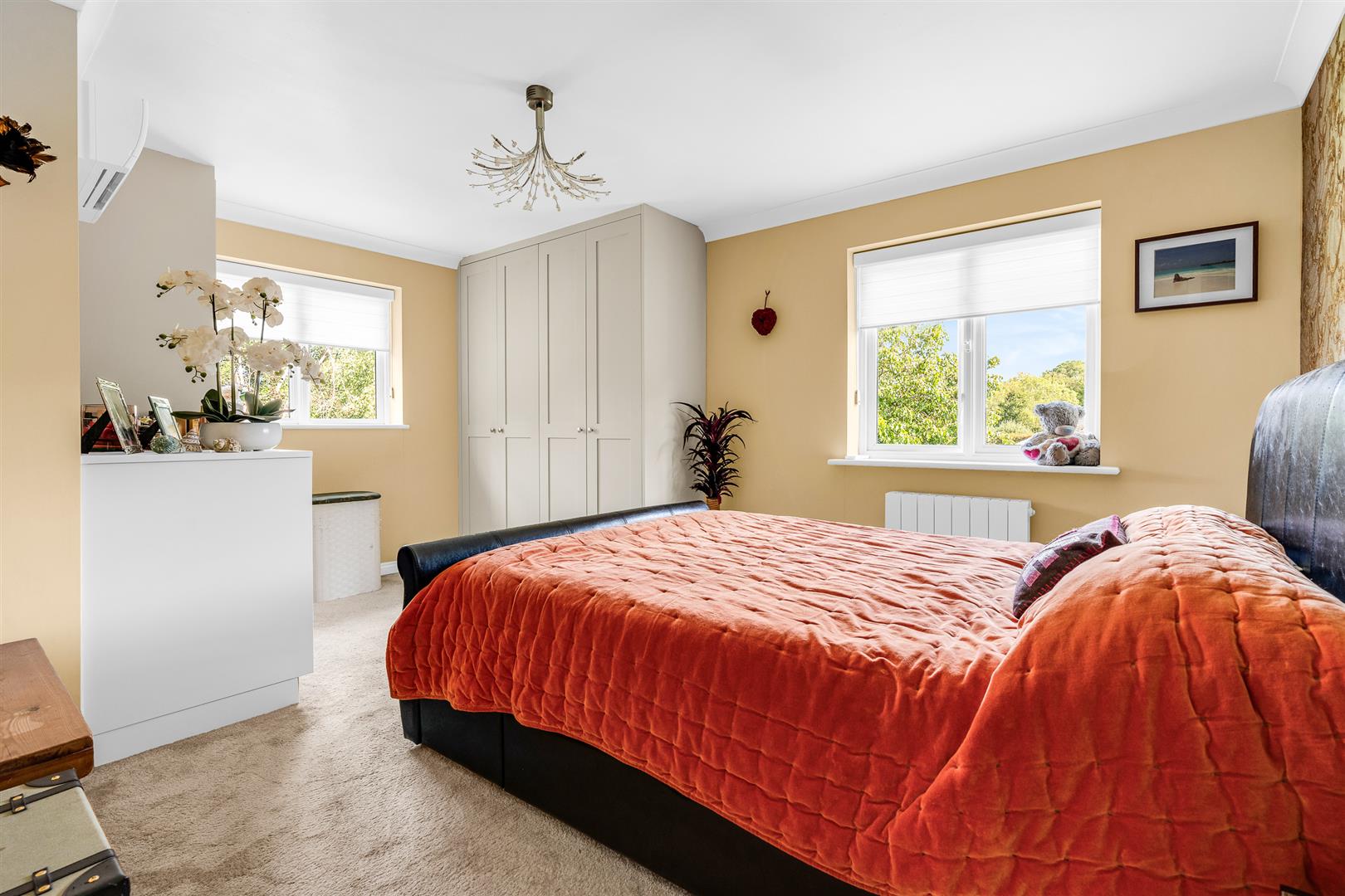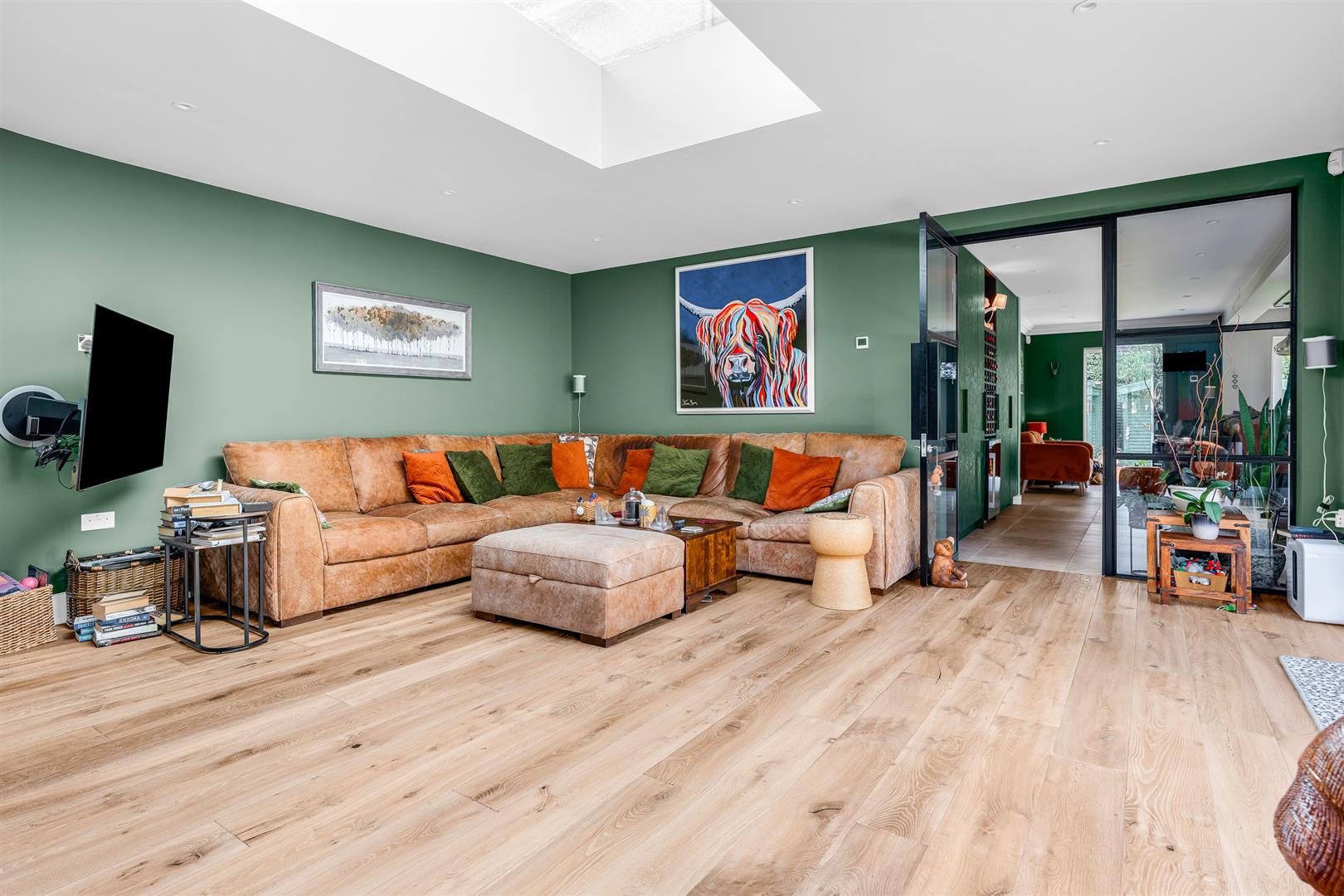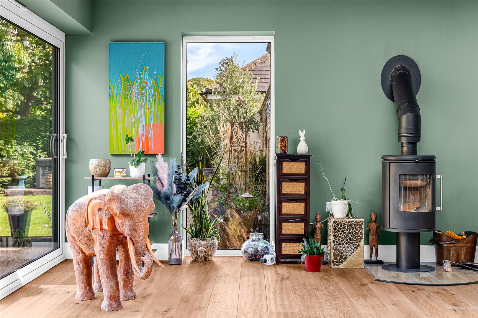 An attractive wall of glass separates the kitchen/dining room from the living room which has a wonderful shaped wall curving gracefully around one side. The whole of the rear wall is taken by a substantial pair of glass sliding doors, allowing you to open the room up to fully link it with the spacious patio outside, a fabulous feature for day to day family life and a real boon when entertaining guests. This room is blessed with unfettered light all day thanks to the sliding glass doors, but also due to the additional full height window to the side and a substantial roof light at the centre of the ceiling. It is a glorious room, with all of the benefits of a conservatory or orangery but without any of the drawbacks, and will be just as comfortable in winter as in summer thanks to the smart modern log burner against the outside wall. The room clearly exhibits the flexible capabilities of this lovely home, with substantial yet well balanced space giving you myriad options as to how best to configure and furnish it. Like the adjacent kitchen, this room is easily large enough to incorporate a generous dining table and chairs, along with other occasional furniture, whilst still leaving ample room for a number of sofas, chairs, coffee tables, and so on. It is ready to work with you and for you to support your lifestyle.