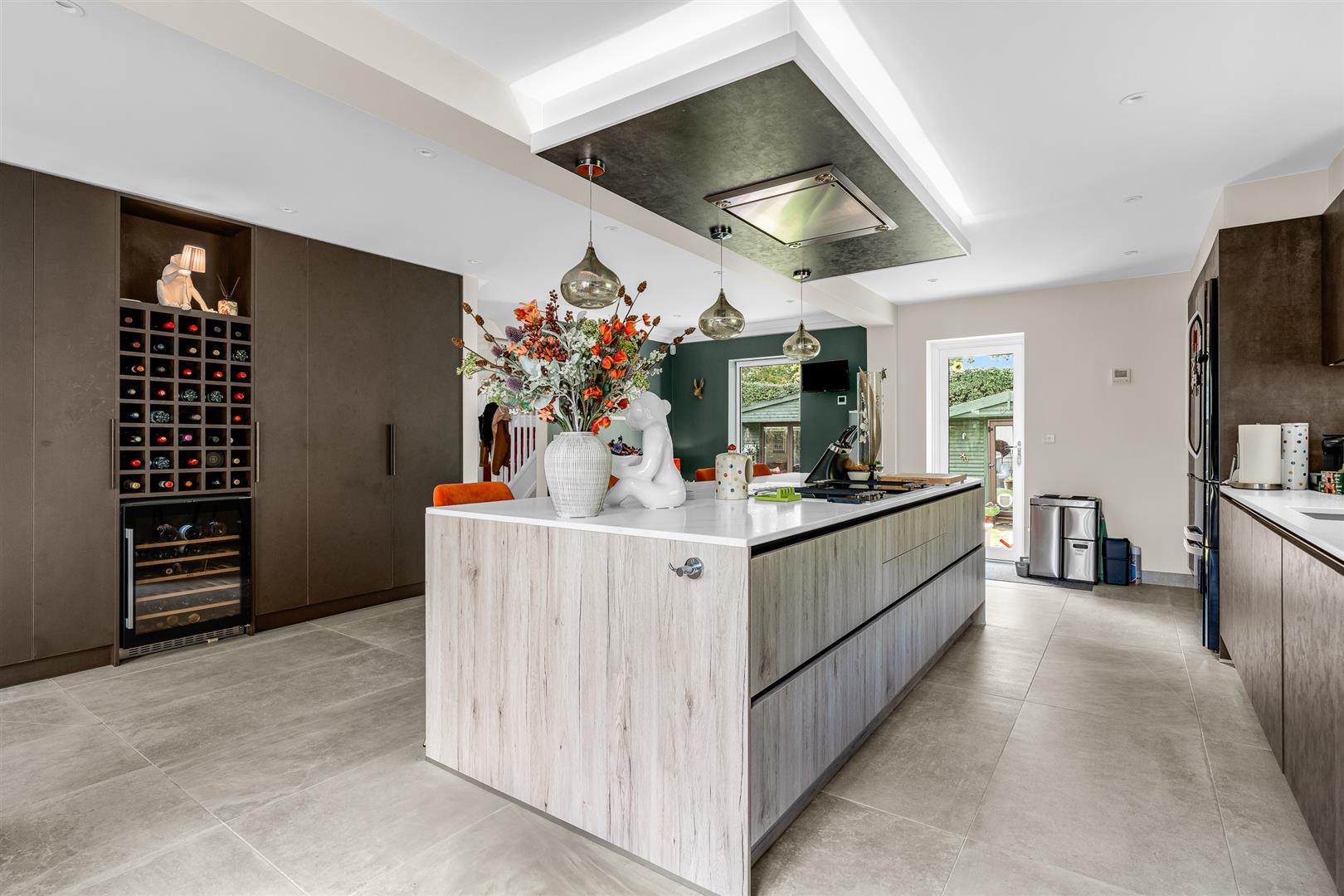 The whole of the rear of the house is taken up by the stunning kitchen/dining room which boasts multiple windows and doors spread around all three of the outside walls, offering easy connectivity out into the garden. This is a beautifully designed space that effortlessly combines all of the facilities you may need within a cool, contemporary setting, fitted with a comprehensive array of wall and floor mounted cabinets that offer more than abundant storage space, and a superb back-lit and mirrored bar with a glass fronted wine cooler, amply supplemented by a large central island that combines worktop, storage and a wonderful breakfast bar running along its full length. Integrated within the chic smoke grey cabinets and the lighter contrasting coloured island is a complete collection of premium branded appliances that are sure to exceed your culinary requirements, along with a designated space for a full height double fronted fridge/freezer. This is a large room by any standards at over twenty two feet by over eighteen feet and it carries its size really well, enjoying nicely balanced proportions and a number of windows around the perimeter allowing nice views out into the garden whilst keeping the room light and bright throughout the day. The terrific breakfast bar comfortably seats five, but there is still abundant open floor space that would easily accept a large dining table should you wish, or, as the current owners have done, make a welcoming area for casual seating alongside the full height window overlooking the rear garden. There are two separate doors out into the garden set at either end of the kitchen, both fully glazed, with one of them having a double sliding design, ensuring a nice easy flow between the outside and inside.
