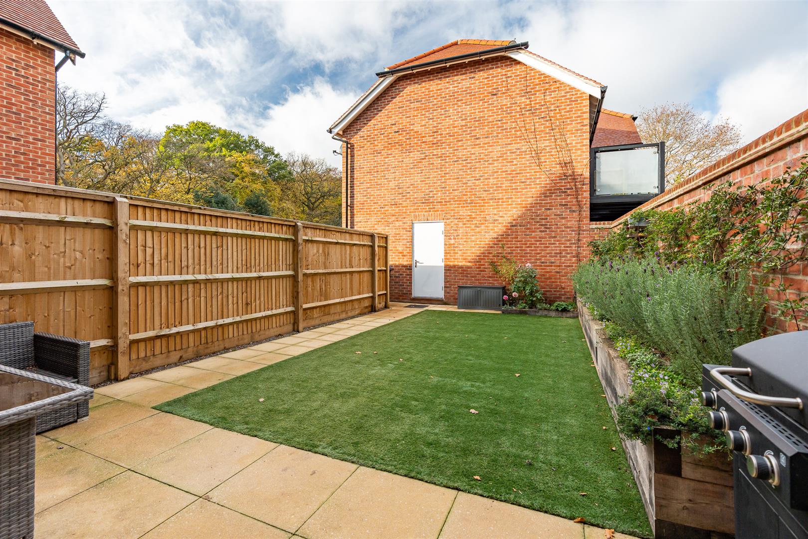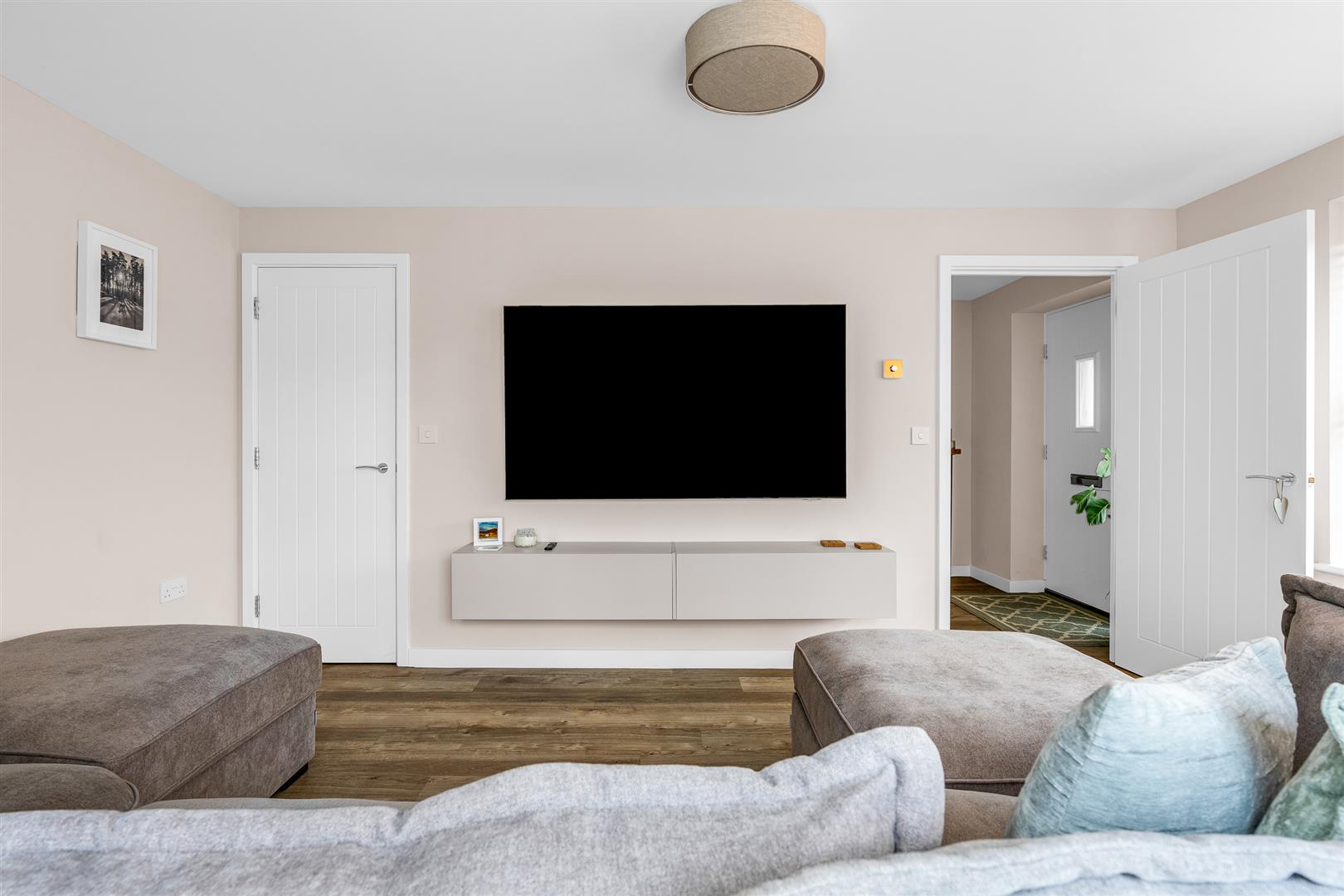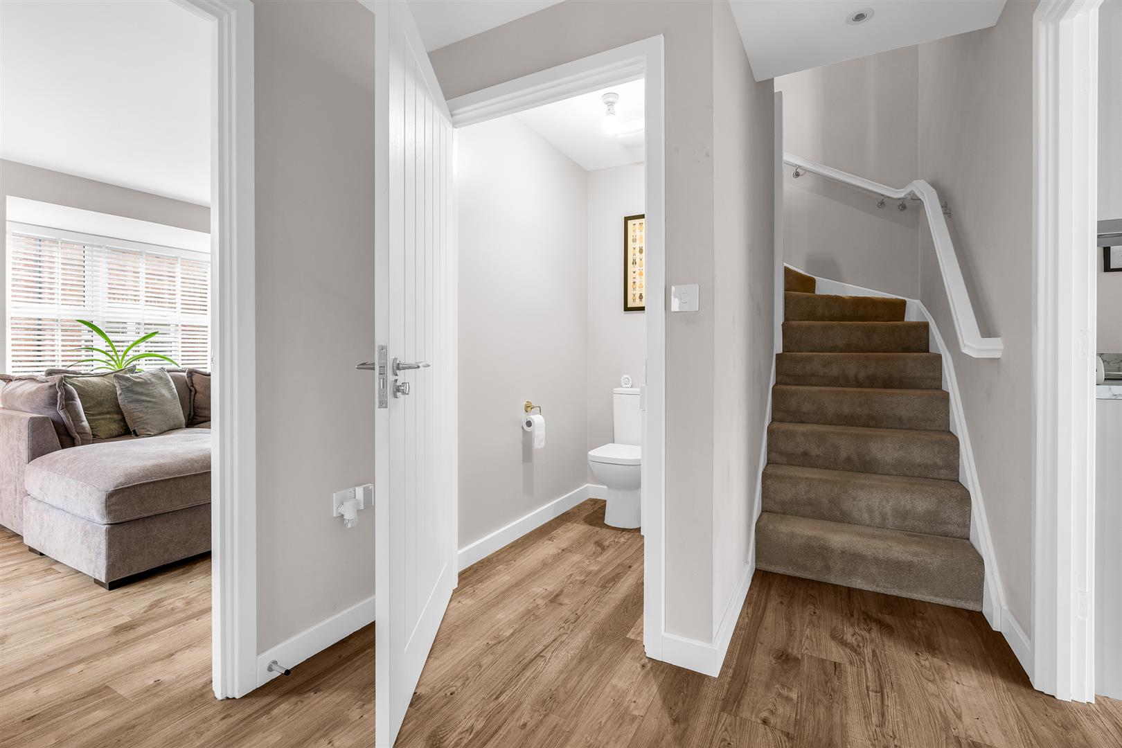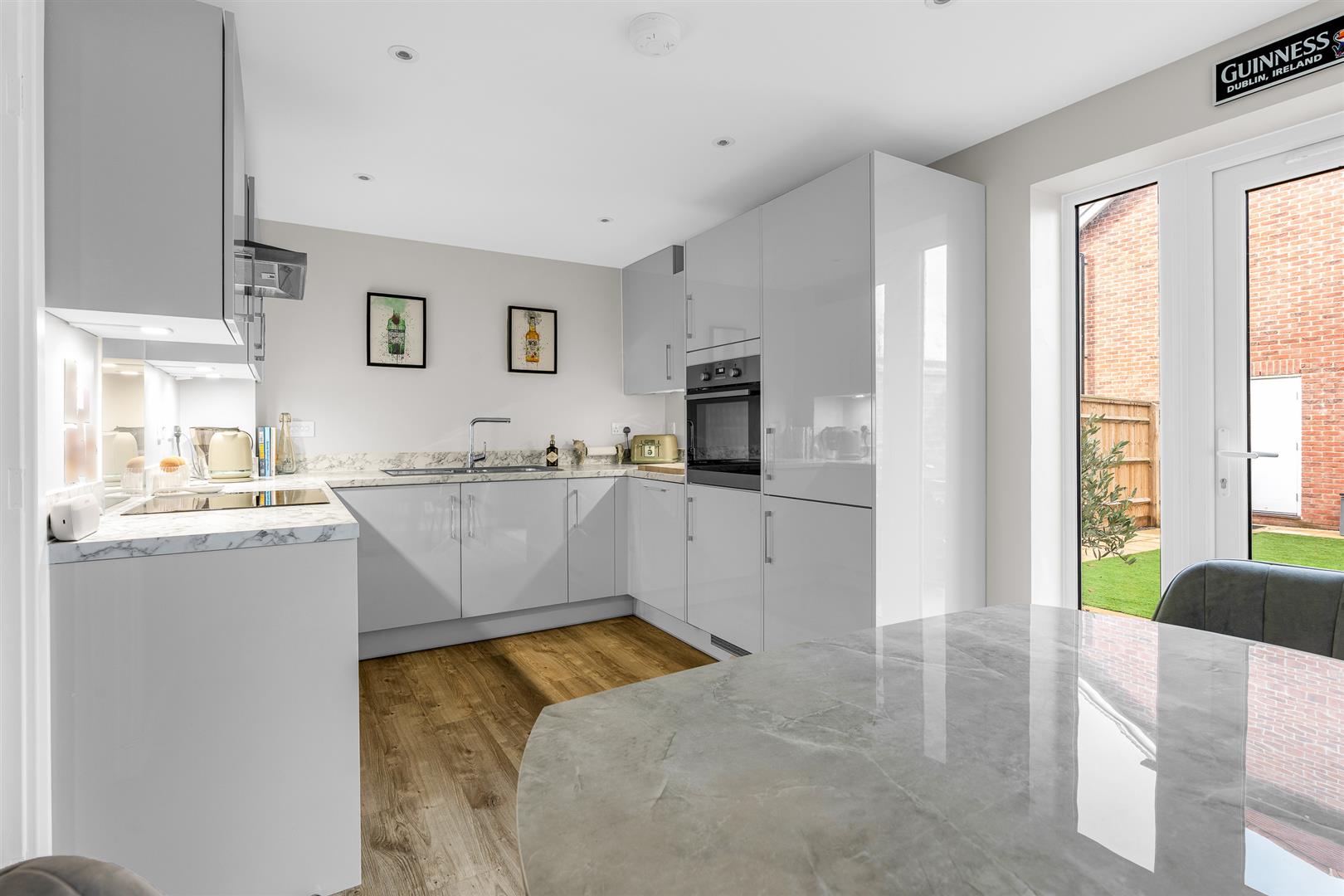 The attractive double-fronted façade, complete with a canopied porch and box bay window, sets a warm and inviting tone on arrival. Inside, the dual-aspect living room is flooded with natural light and features a second box bay window, creating a bright and versatile space. The sleek kitchen/dining room is fitted with a comprehensive range of base and eye-level units and integrated AEG appliances, offering both practicality and modern elegance. A generous cloakroom/WC completes the ground floor.