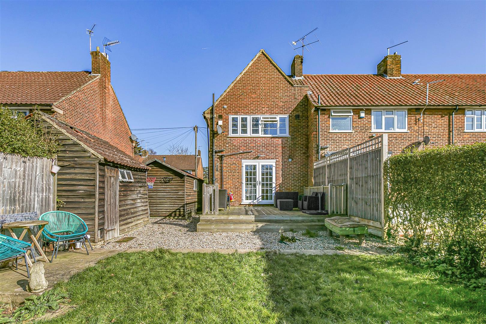 Outside, the frontage has an area of hard-standing and a long driveway that would fit multiple cars leading up to the detached timber garage, there is also an electric car charging port already installed. This additional space may also offer a valuable opportunity to extend, subject to the necessary consents. A useful side gate gives direct access into the rear garden which is fully enclosed and secure, so perfect for children and pets. The rear garden is a good size, both length and width, extending as it does across the back of the garage, and enjoys a lovely open aspect all around. A large raised decking area with spotlights sits just outside the kitchen/dining room, perfect for family time together or a summers evening outside, and the garden extends through a patio and on into the lawn, well screened by mature hedges all around the perimeter.