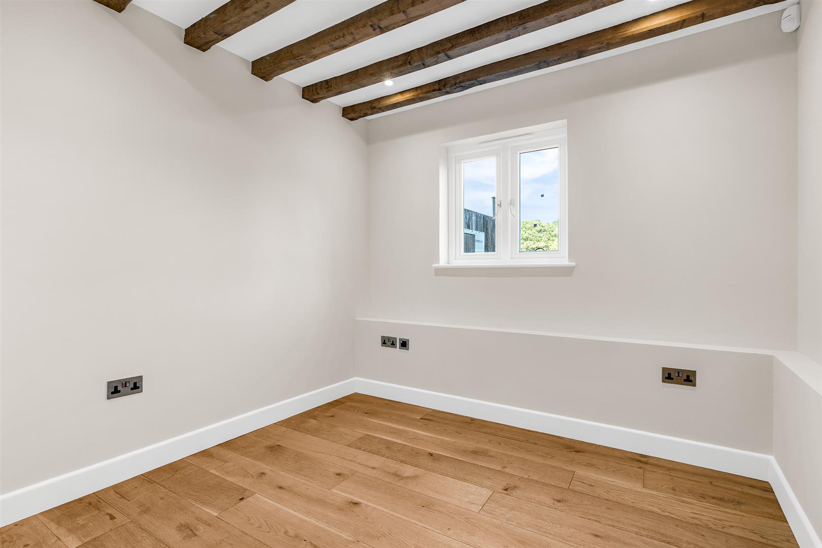 The living room is a large room by any measure that enjoys really well balanced proportions, being pretty much square, and this endows the space with a great ability to be configured and furnished in any way you wish. Comfortably large enough to accept multiple sofas and chairs, as well as other occasional furniture besides, the room is flooded with natural light throughout the day with two windows to the front and large glazed French doors opening out onto the rear patio. It is a blank canvas with a crisp white finish, ready for you to personalise it and make it yours, with the impressive roof beams bringing lovely natural warmth and colour to the space.