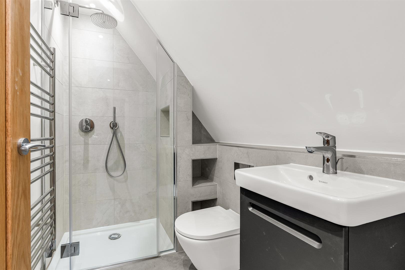 The second floor has a further two large bedrooms, with fabulous vaulted ceilings open into the pitch of the roof. Both bedrooms each have two Velux roof lights and a separate window set into the gable end. There is a further shower room on the second floor shared between the bedrooms and a useful eaves storage cupboard. All three of the bathrooms have electrically heated towel rails/radiators.
