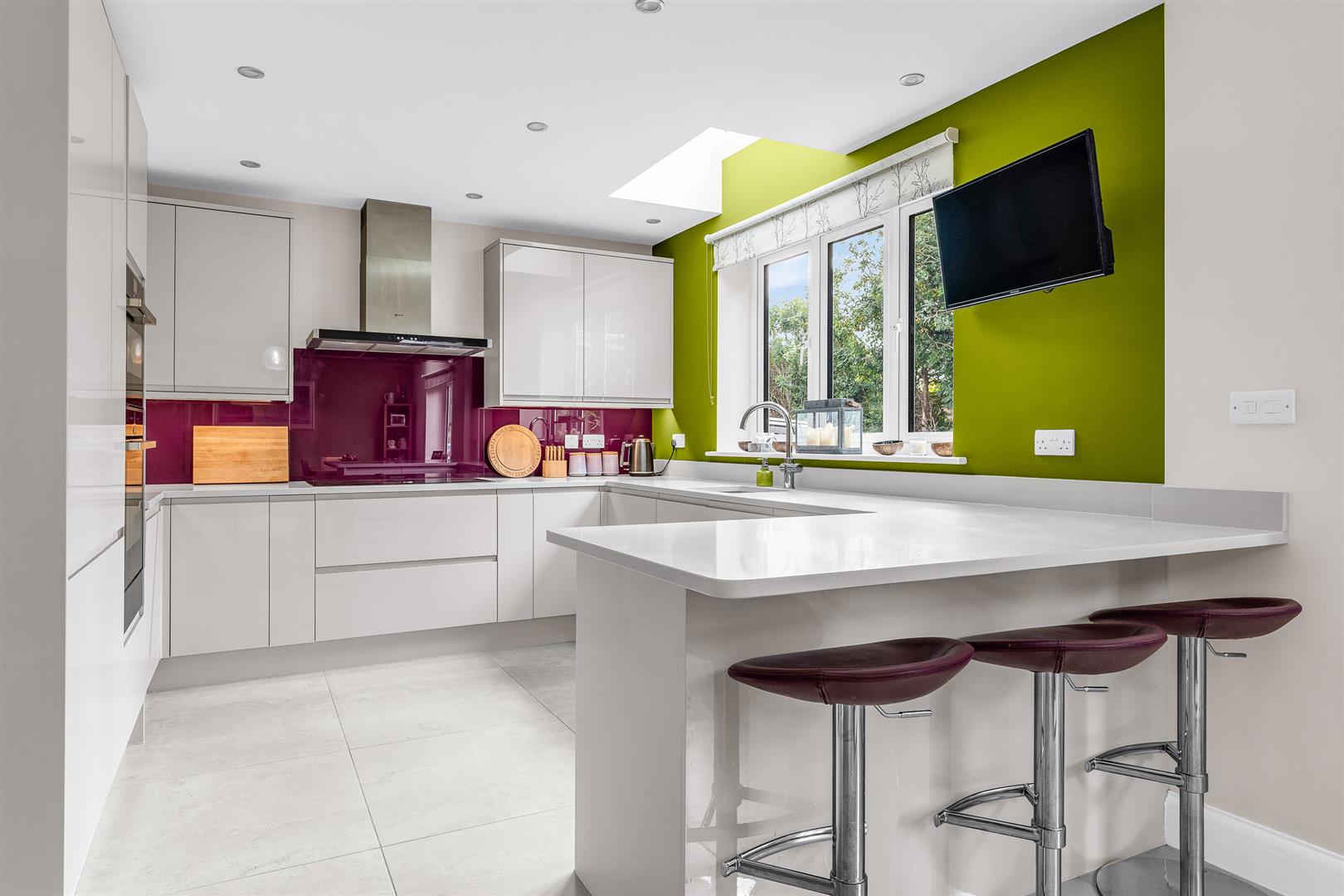 Inside, the porch connects through an inner door into the kitchen/dining room, which is a fabulous open space that is entirely suitable to offer a warm welcome to all your guests. This is a large room by any measure at over twenty-eight feet in length, yet the layout offers a nice balance to the space with the fitted area of the kitchen being neatly delineated from the dining area by an extended island complete with a generous breakfast bar. The kitchen boasts a comprehensive array of beautiful gloss pale grey handle-free wall and floor mounted cupboards that ensure more than ample storage as well as plenty of quartz worktop area, whilst incorporated within the cabinets is a full complement of premium brand appliances ready to meet all your needs. The whole kitchen dining area has underfloor heating. Two substantial windows to the front are ably assisted by two cleverly recessed roof lights to absolutely flood the room with natural daylight, which is further enhanced by the part glazed door from the entrance porch. The remainder of the room is left as open floor space for you to choose your best layout and furnishings, and is comfortably large enough for a generous dining suite and other occasional furniture and casual seating if you so wish. This is a substantial, well designed room that is ideally placed to become the heart and hub of this modern family home.