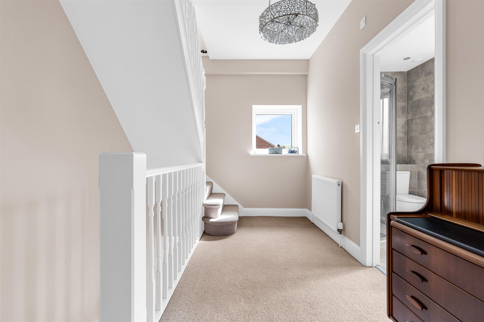 Up on the first floor are located three of the bedrooms, all generous doubles, and the family bathroom which comes equipped with a separate bath and shower. The second floor is fully taken up by a particularly impressive master bedroom suite built into the wonderfully shaped roof space. Two large dormer windows to the front join with two Velux roof lights at the rear to flood the room with natural light throughout the day, whilst multiple fitted wardrobes and cupboards ensure you are never short of storage. The room itself is a very large space, easily able to embrace a super-king bed and other furniture such as casual seating, and is ably served by a luxury en-suite shower room with a generous shower and twin basins. Upon heading back down to the first floor, you are greeted by a picture window on the landing, that frames some idyllic views over rolling countryside whilst simultaneously allowing natural light into the space.