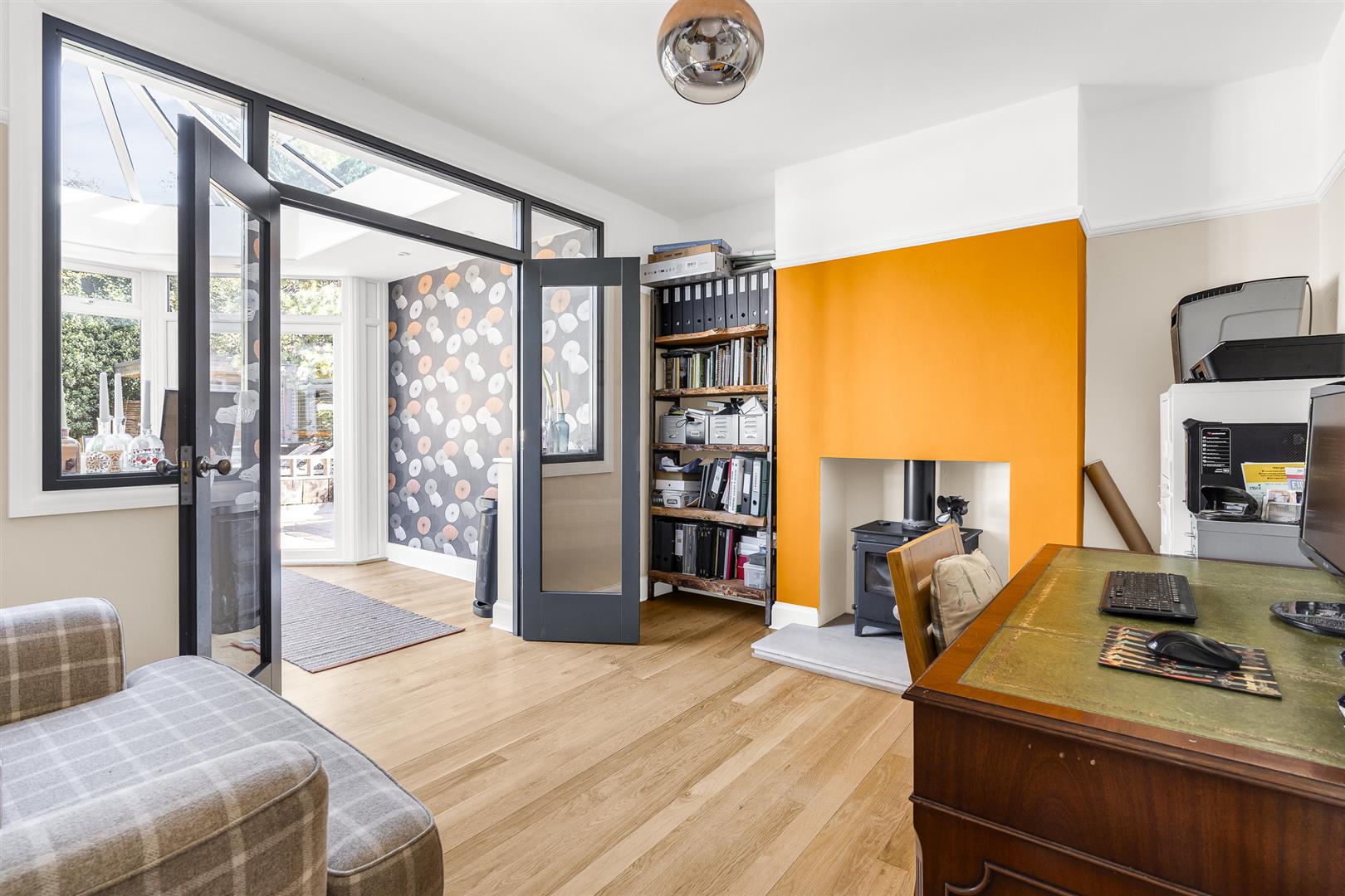 Linking through double width sliding doors from the dining room is the rear facing living room, enjoying abundant light flowing in through the lovely bay window overlooking the garden. Enjoying nicely balanced proportions, being almost square, gives this room an innate ability to cope easily with virtually any layout and furniture you would like, making it a really flexible and adaptable room. Large enough to embrace multiple sofas and chairs with ease, with the added bonus of a terrific modern log burner set within the feature chimney breast.
